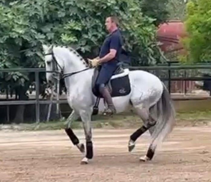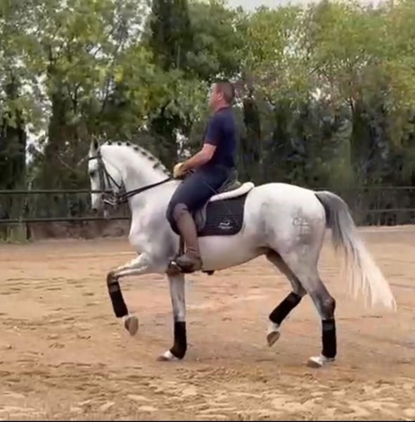 An easy horse, very advanced, and at a really interesting price This horse is a truly pleasant surprise. He doesn't try to impress with his physique, but with his willingness and kindness. Very light, supple in the hand, elastic throughout his body, he weighs nothing and responds to the slightest help. This is what makes him so pleasant to ride. He's preparing for the Grand Prix, and the truth is, he's almost there. He already knows almost all the exercises, and he performs them calmly, precisely, and with great consistency. This is no accident: he's been trained for a long time by a professional Grand Prix-level horse rider, and it shows as soon as you get in the saddle and start asking him questions. On foot, like Ridden, he is always the same: kind, respectful, and calm. He goes out into the countryside without any fear, even alone, without reacting to cars, bicycles, or dogs. A truly safe horse. This is the type of horse that we would recommend without hesitation to a amateur demanding, or to a horse rider who wants to learn and progress with a horse that is already very well equipped... without having to build everything. He is very easy to ride, very forgiving, and makes things simple, even for an average horse rider. X-rays are available (they are not recent, but they exist), and he is negative for piroplasmosis, so ready for export. Frankly, at this level of dressage, with this temperament, at this price… he’s a real opportunity. Castrated, stable, without complications.cathormonal ions: a real asset for those looking for a focused, reliable and easy-to-manage horse on a daily basis. At IberHorse, we know every horse we offer well. If you are looking for a reliable, advanced, and no-nonsense partner, make an appointment and I will explain why this one deserves your attention.