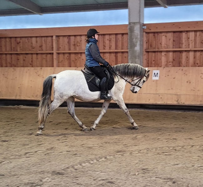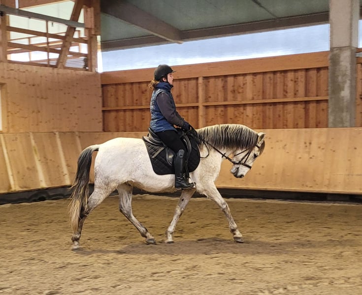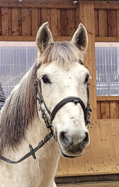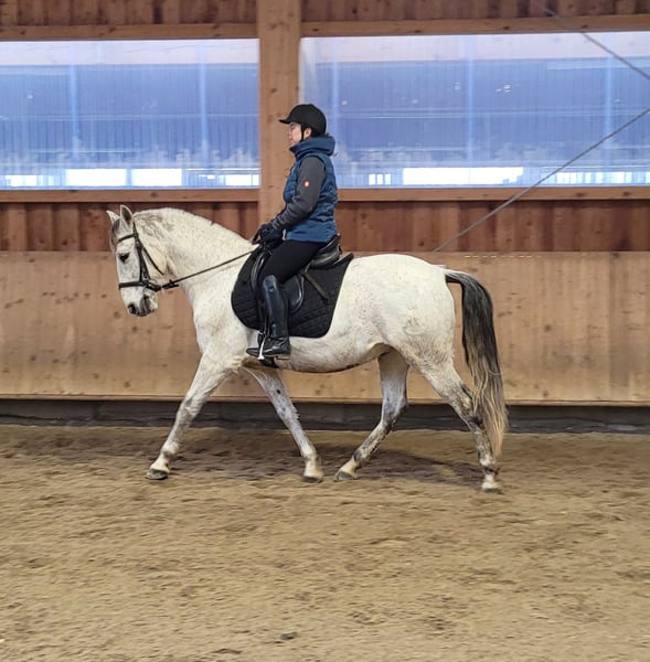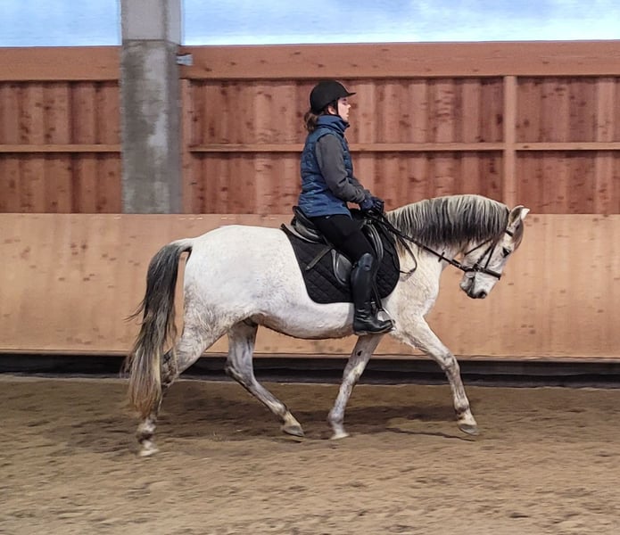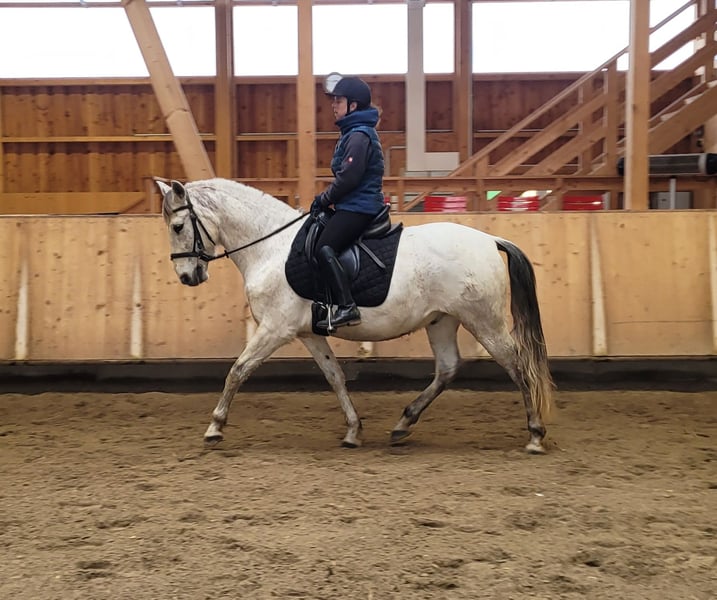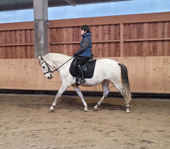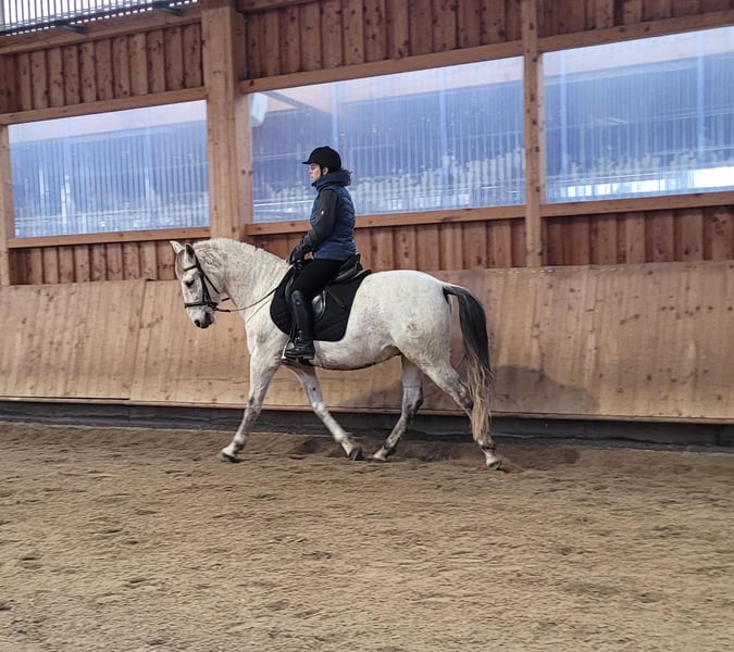 ROSSO ist ein wunderschöner, sehr eleganter P.R.E. Apfelschimmel Wallach. Seine Ruhe und Gelassenheit lassen auch einem noch etwas unsicheren Reiter sehr schnell Vertrauen zu diesem Prachtburschen fassen. ROSSO verzeiht Reitfehler und pariert durch, wenn er merkt, dass sein Reiter unsicher wird. ROSSO ist sehr leichtrittig und äußerst bequem zu sitzen. Er hat drei wunderschöne Grundgangarten. ROSSO ist sehr menschenbezogen und liebt es betüddelt zu werden. Besonders liebt er u. a. die Arbeit mit Kindern und Jugendlichen. Ob im Viereck, Allwetterplatz oder im Gelände, ROSSO geht gut vorwärts, ist nicht triebig, aber auch nicht zu flott unterwegs. ROSSO ist ein Pferd, dass sich den Ansprüchen seines Reiters anpasst, der sich auf seinen Reiter einstellt. Nicht nur unter dem Sattel, sondern auch bei der Bodenarbeit und im alltäglichen Umgang vermittelt ROSSO durch sein gutmütiges Gemüt Sicherheit und zeigt auch sein großes Vertrauen zum Menschen. ROSSO empfiehlt sich besonders für den Umsteiger vom Pony zum Pferd. ROSSO lebt bei uns in einer gemischten Offenstallherde und verträgt sich sehr gut mit seinen Artgenossen. ROSSO kennt auch Boxenhaltung, für die er ebenfalls sehr gut geeignet ist. ROSSO, ein Pferd, dass seinen Menschen nicht jeden Tag vor neue Herausforderungen stellt. Nähere Informationen über unsere Pferde und unsere Arbeit erhalten Sie unter 0171/5269002 Hubert Seitle und 0151/12775701 Uta Großmann. Allgemeine Informationen über unsere Pferde und unsere Arbeit erhalten Sie auch unter www.ps-seitle.de