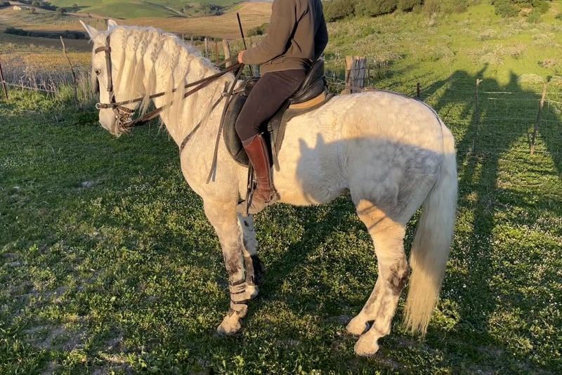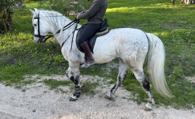 Kastriertes PRE-Pferd, 11 Jahre alt, mit einer Größe von 1,68 m. Hervorzuheben sind seine Edelmütigkeit und seine ausgezeichneten Bewegungen.