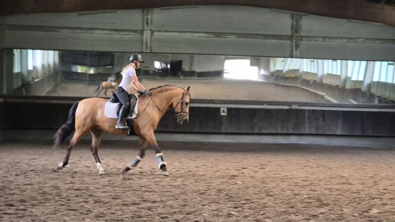 Verkaufe PRE-Wallach Zum Verkauf steht ein eleganter PRE-Wallach, in der seltenen Bayo Farbe, geboren im Jahr 2011. Mit einem Stockmaß von 167 cm vereint er Größe und Präsenz. Das Pferd ist ideal für Dressurbegeisterte, Working Equitation, Doma Vaquera....die ein zuverlässigen und talentierten Partner suchen. Seine ruhige Art im Umgang und sein ausgeglichenes Wesen, aber mit sehr viel GO unter dem Reiter, machen ihn zu einem tollen Begleiter im täglichen Training und der Arbeit, er braucht einen erfahrenen Reiter der ihn in seinem Temperament unterm Reiter zu schätzen weiß. Bei Interesse und für weitere Informationen stehe ich gerne zur Verfügung. Ein Besichtigungstermin ist nach Vereinbarung möglich. Er ist kein Mix! Reinrassiger PRE mit Papiere!