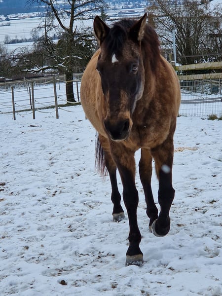 Divo ist ein sehr lieber, gutmütiger Wallach. Er ist eher ranghoch, sicher und charakterfest. Bocken oder Steigen oder flüchten kennt er nicht. Ausritte alleine oder in der Gruppe, verkehrssicher, kennt Hauptstrassen, Camions, Traktoren u.s.w. Sehr gute Hufe, kann beschlagen oder Barhuf sein. Divo sucht eine gute Reiterin, die einen gutes Reitniveau hat. Er eignet sich für jem. der Freude an z.B. Klassischer Reitkunst hat. Seitengänge gehören zu seinem Training, sowie Bodenarbeit und Arbeit an der Longe. Piaffe ist im fortgeschrittenen Prozess, braucht aber noch Zeit. Wegen Überlastung und einer Krankheit muss ich ihn verkaufen. Wenn du ernsthaftes Interesse hast, kannst du ihn besuchen und probereiten. Bedingung: Du bietest ihm einen Offenstall oder zumindest täglichen Weidegang in einer konstanten Gruppe. Ich verkaufe ihn nur an eine erfahrene Person.