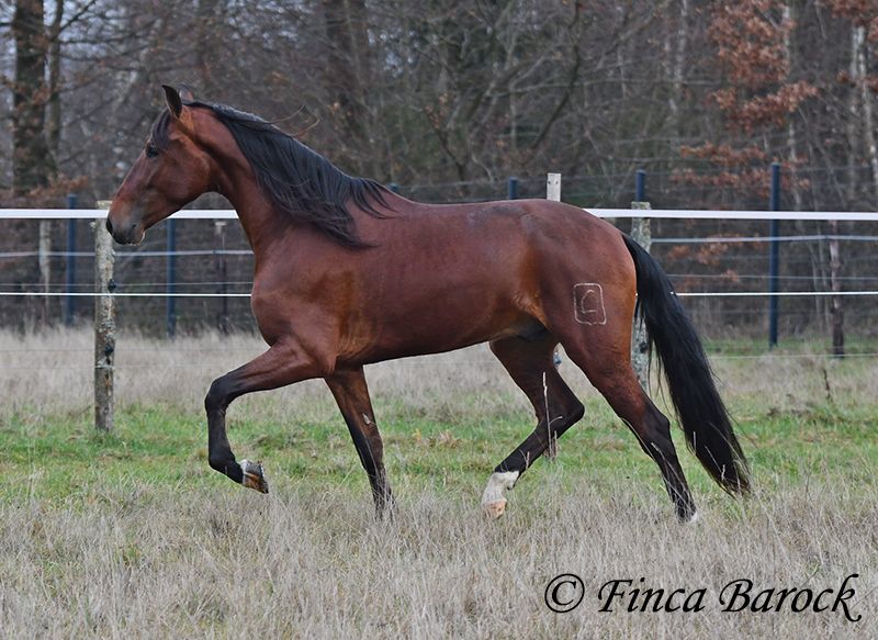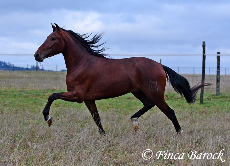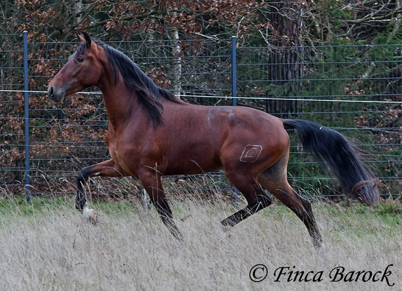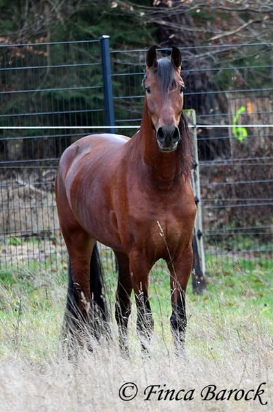 Breed: Andalusian (PRE) Name: Bandolero Gender: Gelding Height: 1.61 m (16.1 hh) Date of Birth: April 1, 2022 Color: Brown Price: €5,500 Sire: Bandolero CXXIII by Jilguero XII Dam: Manzanilla XL by Volador XIII Bandolero is a very handsome, energetic, and affectionate horse who quickly wins everyone over with his friendly nature! He has been lightly backed in the walk, trot, and canter and is a quick learner. Overall, he exudes a great natural calmness, which makes working with him even more enjoyable. He is very open to new experiences and enjoys variety. Riding without a saddle—sure! Walking over a tarp, with dogs running alongside, or passing tractors—Bandolero wants to be part of it all. He has already mastered his first trail rides and tends to be curious rather than scared when faced with "scary" objects, preferring to explore rather than retreat. Bandolero is a comfortable rider and naturally possesses a lovely uphill canter. He is still growing and will continue to develop in size. He is used to herd life, and shows playful and friendly behavior. Includes veterinary examination and X-ray images (due to an X-ray finding, he is offered at a significantly reduced price). Contact: Finca Barock, Tel. 0173-696 31 81, 56291 Wiebelsheim