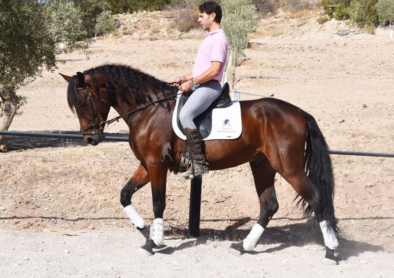 dear character with a pleasant temperament, curious, affectionate, ridden in the basic gaits, some lateral movements, jumps, trail riding, tall, good movements and lineage, suitable for novice riders, lineage: Pedro Maza Iñiguez, Yeguada Militar, Yeguada Puerta Alta, great-grandfathers Obcecado and Femento are qualified www.elegante-andalusier.com