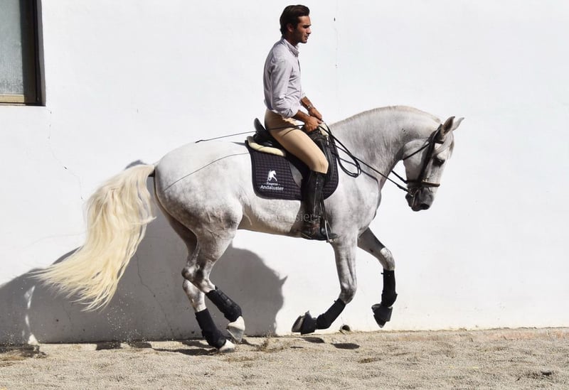 Sweet temperament, curious, affectionate, side passes, rein back, flying changes, bows, kneels, lies down, Spanish walk, Piaffe and Passage started, tall, good movement and pedigree. Pedigree: Yeguada Marques de Quintanar, Granda Losada, with several qualified ancestors. www.elegante-andalusier.com