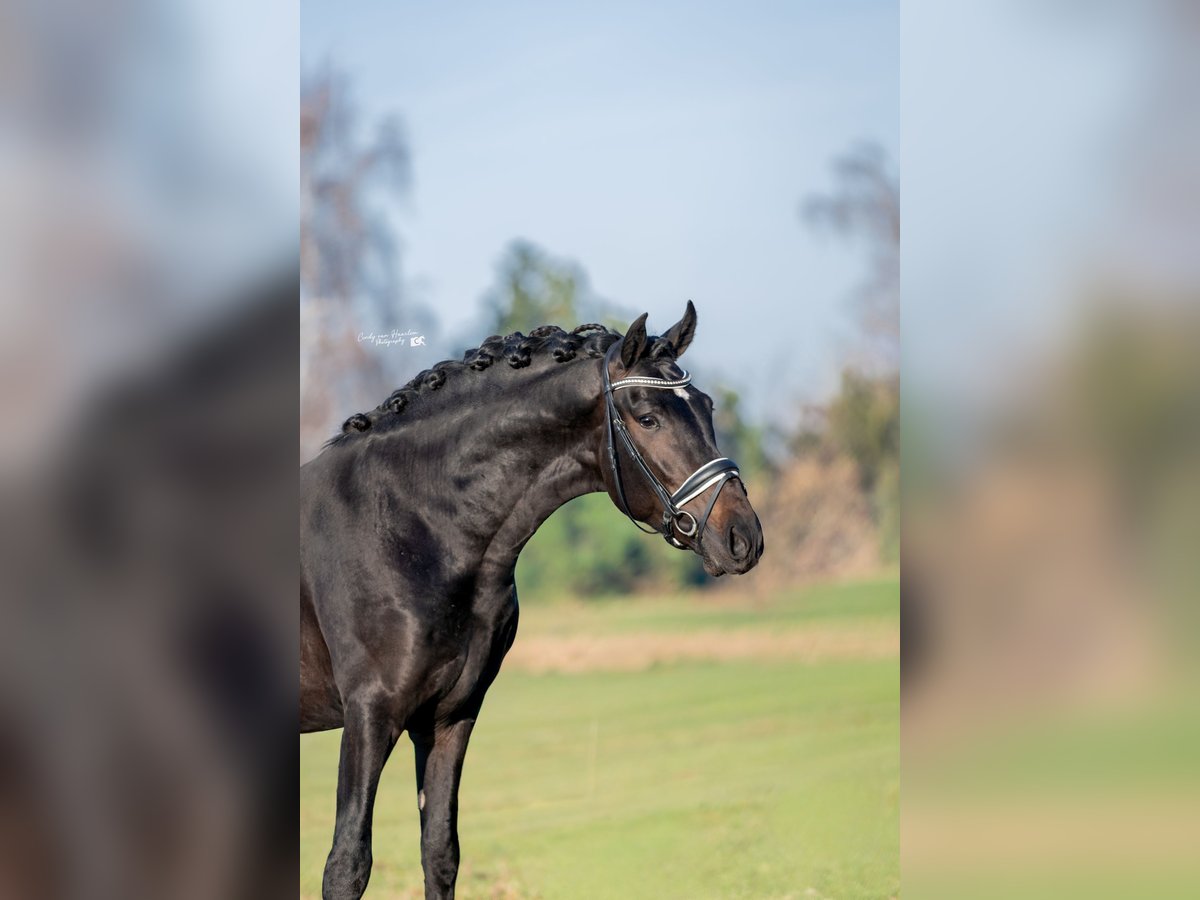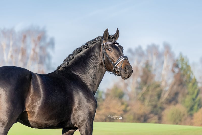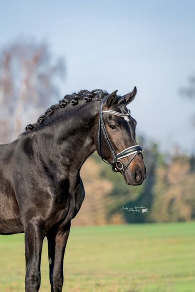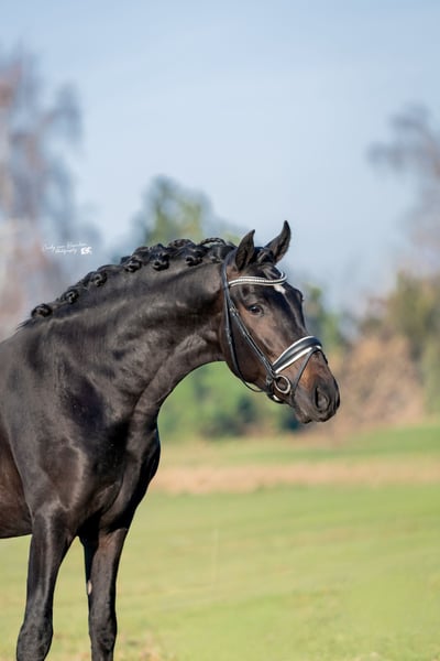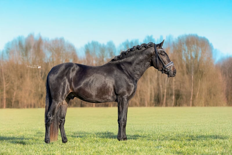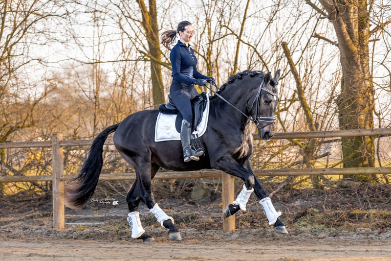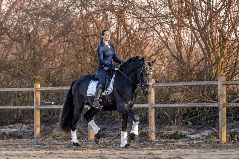 Dieser wunderschöne vierjährige schwarze PRE-Wallach (ca. 170 cm) ist ein echter Blickfang mit einem goldenen Charakter. Seit Oktober letzten Jahres wurde er unter dem Sattel ausgebildet und in den Niederlanden auf eine ruhige, traumafreie Weise eingeritten. Im Umgang ist er äußerst brav und gelassen: Er ist lieb beim Hufschmied und Tierarzt, lädt problemlos auf den Trailer und genießt sichtbar Aufmerksamkeit und Streicheleinheiten. Er arbeitet gerne für seinen Reiter und denkt mit. Unter dem Sattel zeigt er sich als zuverlässiges und bequemes Pferd. Er ist brav bei Ausritten und kennt den Straßenverkehr. Er verfügt über einen großzügigen Schritt und Trab sowie einen schönen bergauf galoppierenden Gang, bei dem er bereits jetzt zeigt, dass das Sammeln in Zukunft kein Problem sein wird. Mit seinem Erscheinungsbild und seinen Bewegungen ist er definitiv ein Pferd, das in der Dressur- oder MCI-Klasse glänzen kann. Gleichzeitig macht sein angenehmes Wesen ihn auch zu einem potenziellen Familienpferd. Er ist nicht sensibel oder nervös, bleibt aber natürlich ein junges Pferd. Daher sehen wir ihn am liebsten bei einem Reiter auf L/M-Niveau oder bei jemandem mit Erfahrung im Umgang mit jungen Pferden. Gute Röntgenbilder inklusive Hals- und Rückenaufnahmen.