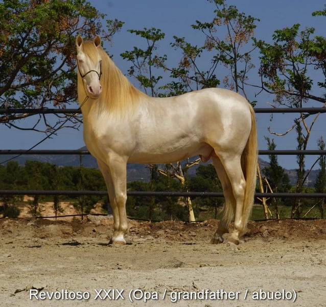 carácter tranquilo con temperamento agradable, curioso, mimoso, domado, grande, buenos movimientos, negro con gen PRL, pedigree: Paco Marti, Hnas San Roman www.elegante-andalusier.com