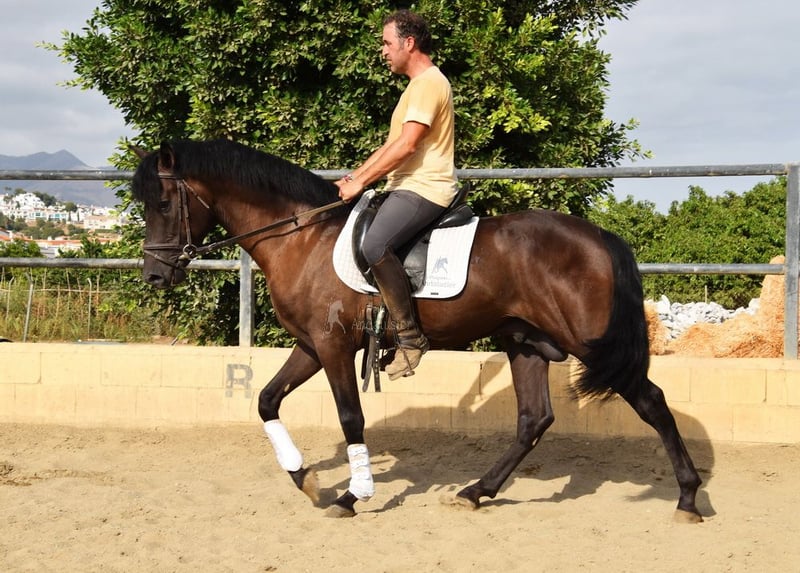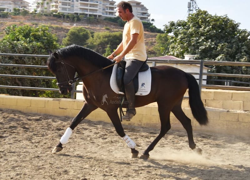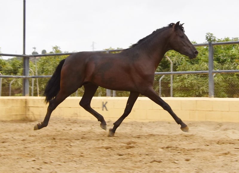 rustig karakter met een aangenaam temperament, nieuwsgierig, bereden in de basisgangen en cross-country, goede bewegingen, zwart paard met PRL-gen, afstamming: Paco Marti, Hnas San Roman www.elegante-andalusier.com