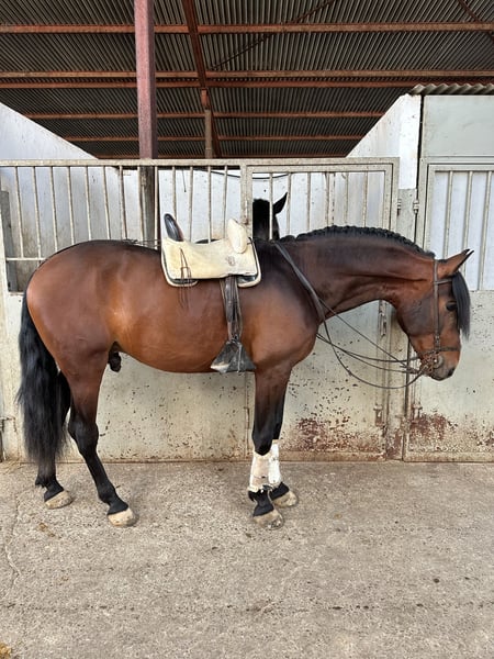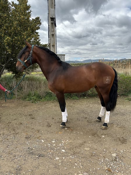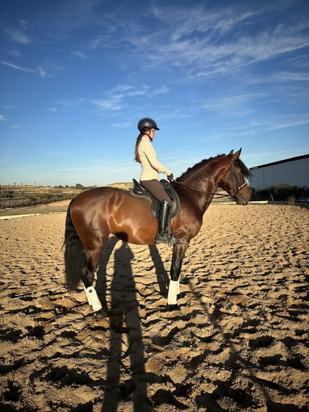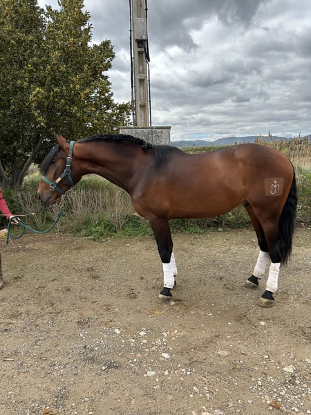 Poulain qui aura 4 ans en juillet, super caractère, très très noble, typiquement espagnol baroque, se déplaçant très bien, faisant des épaules en dedans, des cessions à la jambe, le pas espagnol presque parfait et sortant dans le champ avec une totale tranquillité, que ce soit seul ou accompagné, cheval avec un énorme potentiel.