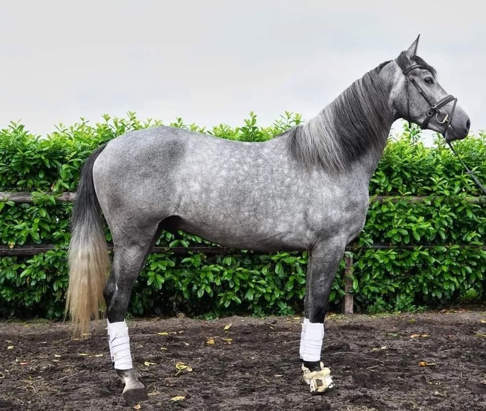 Lucero is a cheerful, affectionate, and sensible PRE gelding. He moves smoothly and easily in dressage, makes lovely jumps, and enjoys going on trail rides! Under saddle, he is EXTREMELY well-behaved, calm, and definitely not hot. Lucero experiences some nervousness when mounting, but we have found a gentle approach that helps him feel comfortable. Because of this, I do not consider Lucero suitable for an inexperienced or clumsy rider or lady. We mount with assistance and treats, and he is only familiar with mounting in this way. Videos of this are available. I also believe Lucero is suitable as a hunter: thanks to his steady and calm temperament and his flat, easy canter, he will perform well in the hunter discipline once given proper training. Lucero makes excellent jumps. Videos of him jumping freely are available. The price for this talented, lovely horse is negotiable for a good home.