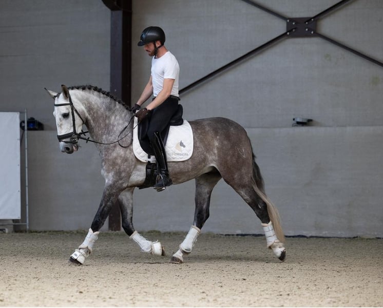 We present an elegant, baroque-looking horse born in 2020 and measuring 167 cm tall, who stands out for his beauty, morphological harmony, and functionality. He is an ideal horse for experienced amateur riders seeking a reliable companion with quality movement. Regarding his training under saddle, he responds correctly and clearly to aids, displaying a cooperative and balanced attitude. He is currently working on advanced dressage exercises, smoothly executing piaffes, pirouettes, and supports, making him a versatile and highly attractive horse for those who want to enjoy recreational riding with added technical skill. His character is noble and manageable, making him easy to handle both daily and enjoyable in the arena. His baroque physique provides presence and elegance, highly appreciated characteristics in this type of horse, while being comfortable and pleasant to ride. This horse is an excellent choice for those seeking a beautiful, functional, and safe horse, with which to enjoy riding at a challenging level yet accessible to an experienced enthusiast.