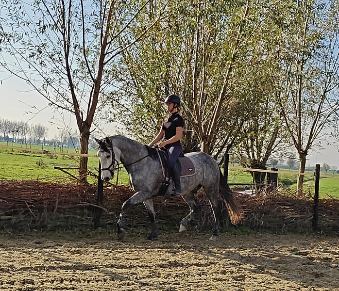 For sale: a well-behaved 6-year-old PRE gelding with a carta, approximately 1.67 m. He arrived in the Netherlands as a foal and has always been handled gently. Bolero is a super gentle gelding who enjoys playing with other horses and is always eager to join in activities. He is calm and well-mannered, but also sensitive. Therefore, I am looking for someone who trains him in a kind and respectful manner. Bolero loves many things. He is familiar with ground work, really enjoys liberty dressage (mainly because of the treats), and can also work in hand. We regularly do pole work and small jumps. He has been under saddle since last spring, with increased training over the past three months. He was saddle-trained at age four, but due to my pregnancy, he had a break from riding to allow him to grow comfortably. Bolero adapts quickly to riding, responds well to seat aids, and learns fast. As he is still young, he can sometimes become a bit tense, but this usually passes quickly. He remains calm and does not bolt or behave badly. Because of this, he is not suitable for beginners. Currently, Bolero is turned out 24/7 with a shelter, where he thrives. He is easy to trim (never shod), and has received vaccinations and other care. In 2024, he has also been fully vetted. I am looking for a wonderful, loving home for him. I wish for him to find an owner who enjoys a variety of activities and can provide him with stimulating and respectful training. If you have any questions or if this sounds like the perfect horse for you, please don’t hesitate to contact me!