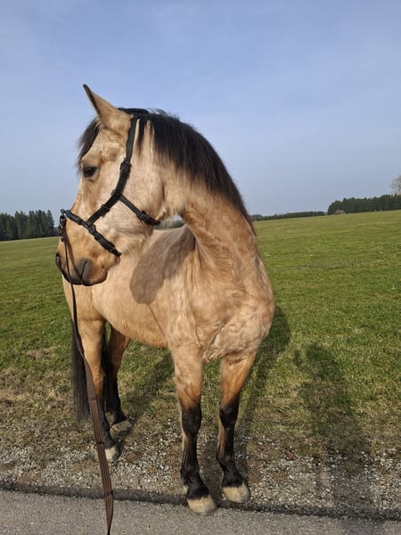 For sale is the 7-year-old PRE gelding "Camaro." He is approximately 16.1 hh, correctly built, has a very good canter, and is very people-oriented. He is well-behaved in handling, shoe- and load-in tolerant. Currently, he is barefoot. He has been in training with me for the past two months, as he previously had negative riding experiences, which caused him to become stressed when ridden. No bucking. He is a very sensitive yet somewhat dominant horse, which, combined with his past experiences, makes him unsuitable for beginners. He is now walking and trotting under saddle in the indoor arena and on the riding ground, and he is able to go out alone in the field. We are looking for an experienced, gentle rider who can work patiently and calmly with him to address his issues. Alternatively, he can remain in training for further development. Serious inquiries with a brief introduction are welcome. Viewings can be arranged by appointment (40€). Located near 87435 Kempten.