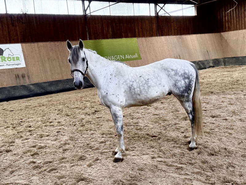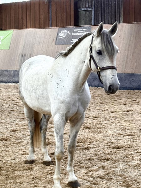 🐎 Arista – Oldenburger Schimmelgelding, 6 Jahre alt – Ein Rohdiamant mit Herz und Verstand Arista ist ein wunderschöner, 6-jähriger Oldenburger, der mit seiner Ausstrahlung und seinem aufrichtigen Wesen begeistert. Er befindet sich noch in der Ausbildung und sucht einen Menschen, der ihn mit Geduld, Erfahrung und Leidenschaft weiter fördert. 💫 Charakter & Ausbildungspotenzial Arista zeigt sich im täglichen Training stets motiviert, lernwillig und bemüht, alles richtig zu machen. Ob Longieren, Bodenarbeit oder Schrecktraining – er nimmt neue Aufgaben neugierig und engagiert an. Er ist ein Rohdiamant, der mit Liebe und Feingefühl geschliffen werden möchte. ❤️ Was Arista braucht • Einen erfahrenen Pferdehalter mit Ruhe, Sicherheit und einem großen Herz für Spanier • Keine Anfänger oder Wiedereinsteiger – Arista soll gefördert und weiter ausgebildet werden • Jemanden, der ihn nicht nur reitet, sondern mit ihm wächst 🏡 Haltung & Umfeld • Boxenhaltung mit Paddock und täglichem Koppelgang • Sozialverträglich, rangniedrig in der Herde • Kennt Hunde, Radlader und Traktoren • Zeigt sich stets mit positiver Arbeitseinstellung • Sehr guter Bewegungsablauf 💶 Probereiten 30 € – wird beim Kauf angerechnet. Bitte nur ernsthafte und passende Anfragen.