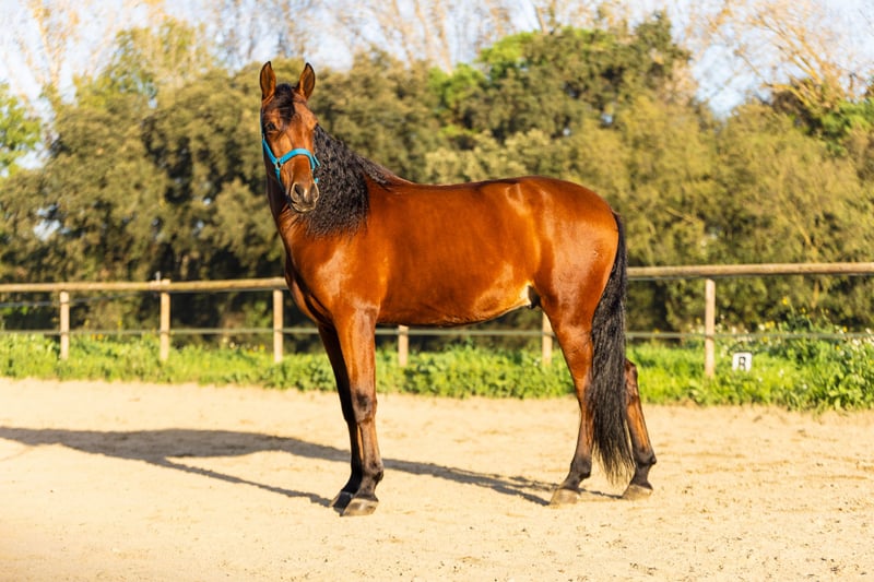 Pura Raza Español Línia deportiva Caballo castrado 1.68cm Sangre caliente Trabajo en doma clásica, muy trabajador Domado en pista Acostumbrado a hacer excursiones y rutas largas Nada asustadizo Excelente carácter, muy noble y cariñoso Ideal para jóvenes y adultos