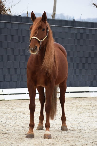 For sale is a stunning Pura Raza Española x Lusitano gelding, born in 2017, standing approximately 16.3 hh, with a beautiful chestnut coat. He is a real eye-catcher, featuring correct, compact conformation and is in excellent health. Top-quality X-ray images are available. He is regularly vaccinated and dewormed and is accustomed to box stabling with paddock turnout. Character-wise, he is an absolute gem: very human-oriented, incredibly affectionate, super sweet in handling, friendly, fearless, curious, and open-minded. He is always pleasant and straightforward in daily handling. Under saddle, he impresses with very good basic gaits, especially an exceptionally powerful trot. He is very talented, eager to learn, and has been trained in a versatile manner, ridden beautifully in collected work, and offers enormous fun. He is capable of flying changes, all lateral movements, passage, and piaffe, and also performs superbly and reliably in the terrain. Currently in training. This beautiful and well-trained horse is ideal for an motivated rider seeking a special horse for dressage, working equitation, or advanced leisure riding. A true dream horse with great potential and an outstanding character.