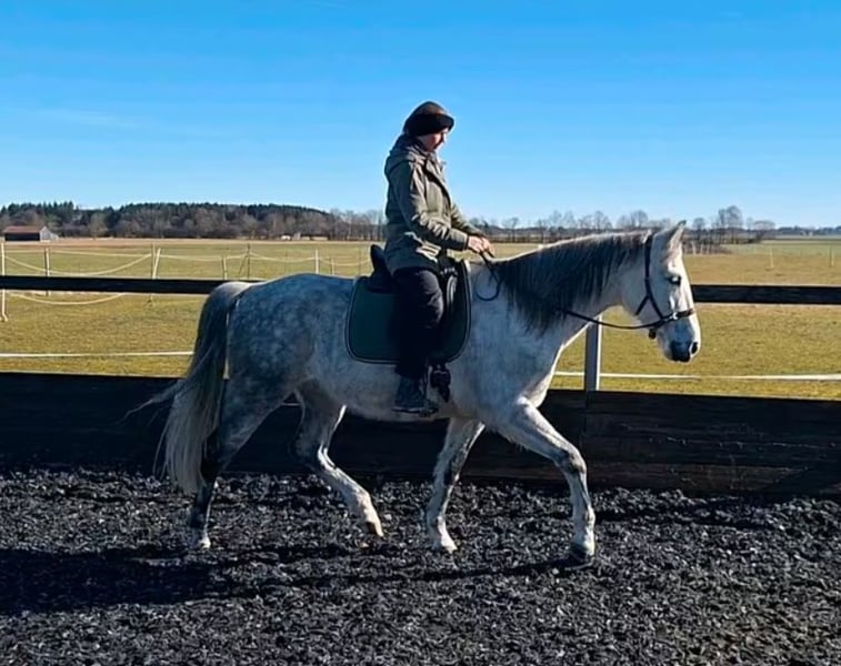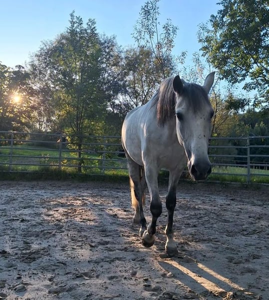 Gatsby, born May 2017, is a purebred PRE gelding. He stands approximately 1.64 meters (16.1 hh) tall and is a gray (white) horse. He is playful, affectionate, and very people-oriented. He came to me at the age of 3.5 years. Initially, he was worked from the ground and we went on many walks. After gentle riding training began at 4.5 years old, Gatsby is currently being exercised recreationally and further educated. This includes riding on the arena and in the field, as well as fascia work and groundwork. He is farrier- and loading-friendly, knows small children, dogs, tractors, and traffic. Gatsby is healthy, eczema-free, vaccinated, and dewormed. Gatsby requires clear, friendly guidance and is only suitable for an experienced horse person. He is gentle and polite in handling, eager to please, and wants to do everything right. However, he is also sensitive, needing patience, consistency, and a gentle hand. If these criteria are met, Gatsby is a real pleasure to ride; he is motivated and eager to learn. He feels most comfortable in a small herd with his own paddock box for the night. My hope is to find Gatsby’s soulmate and to give him a forever home. Priority goes to placement over price. Videos and further information gladly available upon request. No sales to dealers or riding schools.