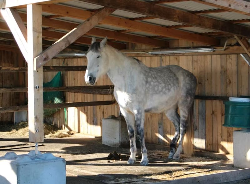 Offenstall für Allergiker - ganzjähriger Aufenthalt mit 7 Pferden in einem Auslauf mit Unterstand, Fress- und Liegebereich - adlibitum Heulage in überdachten Raufen mit Netz - Individueller Weidegang - beheizte Tränke - Sattelkammer mit überdachtem Putzplatz sowie beheizter Deckenraum - komplette Anlagenbenutzung