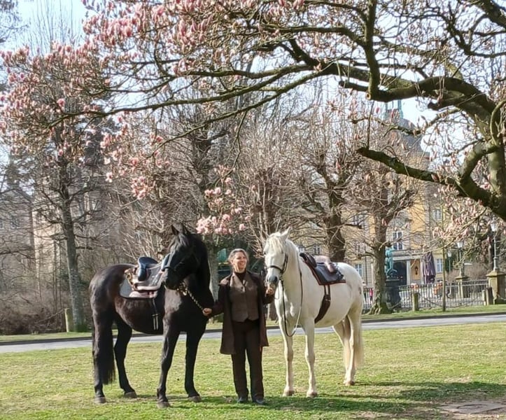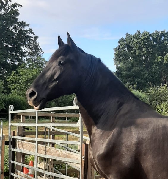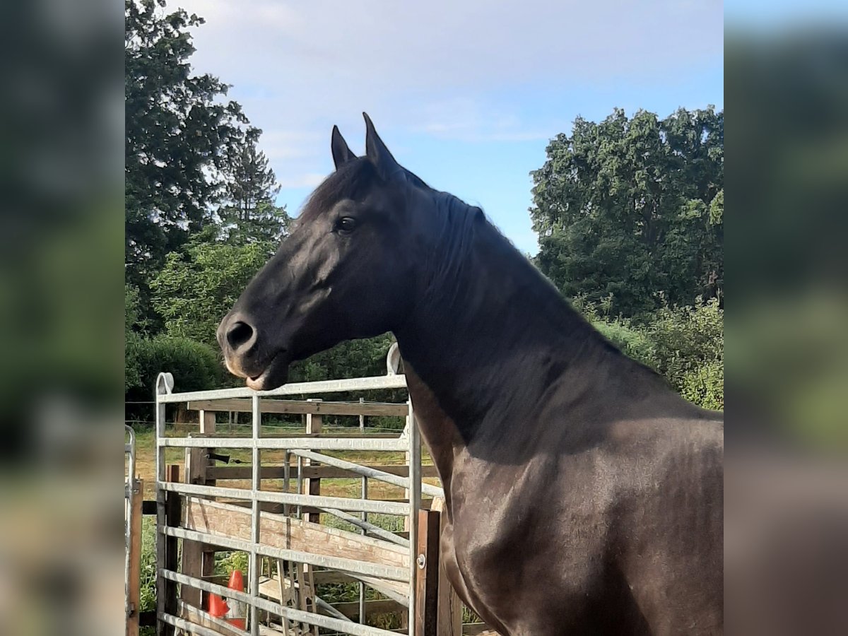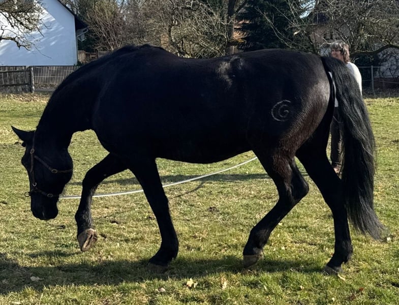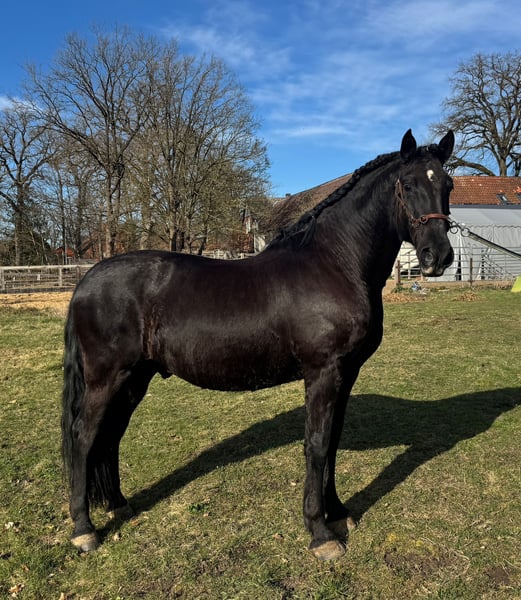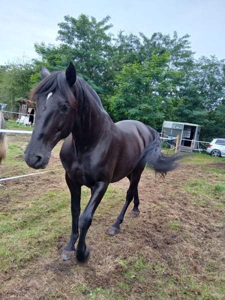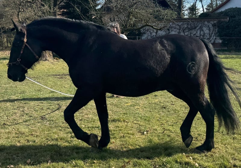 We are not looking to make a profit! Our main goal is to find a truly good home for this wonderful horse. Camaron (known as Schoki) has a striking presence, standing approximately 16.1 hh with a strong build. His appearance is simply breathtaking—like a shiny black pigskin in summer... even without grooming ;-). Riding him feels like sitting on a sofa. He is being trained in classical dressage, starting with a Baucher bit and a bosal. He is incredibly attentive and learns very quickly. He naturally masters the basic gaits, can perform the Spanish walk, lateral movements, and is beginning to Piaffe. Due to his Iberian-type intelligence, a confident rider who knows what they are doing is essential. But he is always gentle and cooperative. In his herd, he ranks high but is never overbearing. ... big mouth, no bite ... He has been with me since he was 4 years old. Now, at 8, he is still very unspoiled and currently not in training at all. Regrettably, I have to part with him for health reasons in his best interest, so he can be properly promoted according to his abilities. He can be viewed locally. However, to avoid riding tourism, he can only be tried under saddle by genuine interest, for a fee of €30. This is not an emergency sale. Inquiries from dealers are pointless. Price is negotiable for a good home!