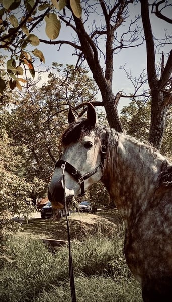 I am selling my extremely handsome PRE gelding, Garabato Don, known as Scirocco. Scirocco has specific requirements for his living environment, which I am unfortunately unable to provide. He absolutely needs: - An open stall with 24-hour hay supply - A sturdy, dry shelter (not just a field tent) - No straw (not even as bedding) - A consistent, social herd The 8-year-old gelding is gently trained according to classical riding principles and always eager to please. He is well-behaved both alone and in a group when hacking out. Currently, he is only ridden bitless, which he clearly prefers over bitted riding. However, he is also familiar with a bit. His teeth are regularly checked. He knows classical groundwork, as well as small circus tricks and liberty work, which he enjoys greatly. He is barefoot but somewhat sensitive; he needs hoof boots on stony ground. He has also been shod before. Additionally, he has a deformity in the front (toe-in), but this does not affect his movement. Optional: the tack can be purchased together with him (Signum Paddle, Signum saddle pad, as well as bits and a cavesson). Scirocco is only available to someone who can provide an open stall and genuinely takes the time to engage him on multiple levels. Feel free to contact me with any questions! Meetings and trial riding are possible by appointment.