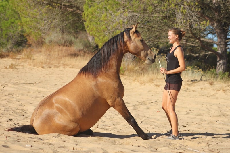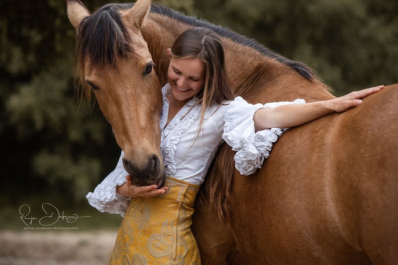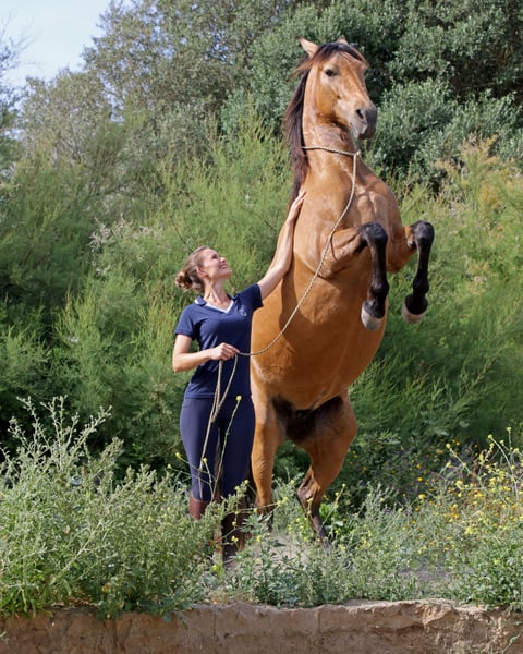 For personal reasons, I am looking to place my mare in new loving hands. Buena is a dream horse in a special color, who simply brings joy to work. She has extensive training in groundwork and liberty work, responds sensitively to body language, and is being trained with a mix of horsemanship and classical riding art. So far, she has been ridden completely bitless. Buena's favorite activities are liberty work, including many tricks. She is full of energy and loves to show what she can do. These include: - Spanish walk - Spanish salute - Rear up - Collected halt - Twist (turning around her own body) - Sit - Backing up towards you - Side leaps - Bow - Podium and horse seesaw Buena's new owner should also bring joy to groundwork and liberty work. Under saddle, she can perform the basics such as leg yielding, shoulder-in, and turns on the forehand and hindquarters. Parking assistance included. She also goes wonderfully and relaxed in the outdoors, but she is only used to going out in a group. Going out alone would need to be learned. Buena is only accustomed to herd living and will only be sold into a herd. She is very sociable, whether with other mares or geldings. I bought Buena unbacked at 3.5 years old. She has lived with me in Spain so far but has been in Germany for a few months. The reason I am offering this dream horse at such a low price is that Buena is currently recovering from an injury. Since I am moving and do not want to integrate Buena into a new herd for a short period, I am already looking for a new owner. Thus, it is a unique opportunity for a unique horse at a great price. Once Buena is fit again, her price will increase. In my opinion, she can recover just as well with her new owner. I know she will be fit again; she just needs some time. If you are interested, I look forward to hearing from you. I will, of course, provide detailed information about the injury. Melina