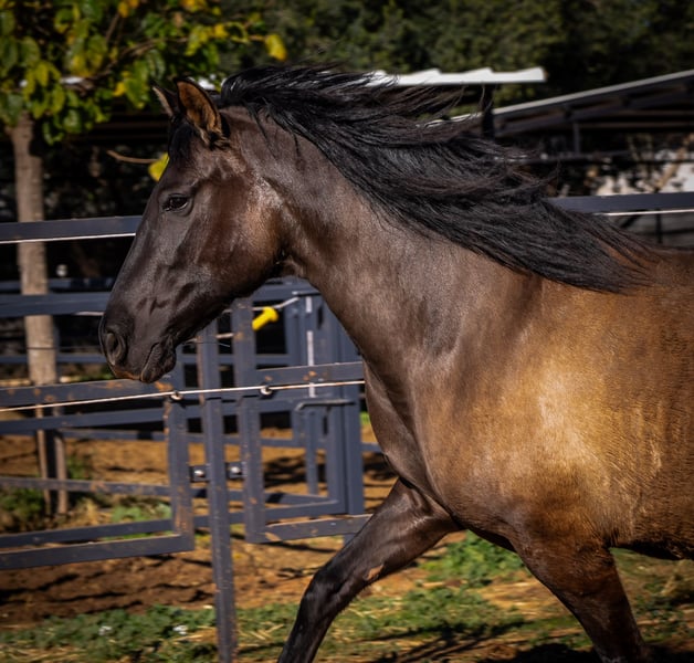 The beautiful PRE mare Festiva enchants with her rare color Smokey Black (Dun) and stands in the stallion type. With her harmonious size and elegant charisma, she is an absolute eye-catcher. Festiva is a true lady of the heart - she loves to be cuddled extensively and is a friendly and confident leader in our small group of three. Another highlight: Festiva is expecting her first foal! The sire is an impressive Isabelo stallion and the birth of this little miracle is expected in March/April 2025 (ultrasound confirmed). We are already full of anticipation for this promising young horse. The mare can also be purchased individually after weaning. Festiva is fed a very natural and varied diet: alfalfa, green oats, fresh twigs, carefully selected herbs and high-quality minerals ensure an optimal supply. She is familiar with both electric and metal fences and lives with her stable mates in an open stable - an environment in which she is very social and relaxed. If you would like to know more about Festiva or see more pictures (including the stallion), please write me a PN!