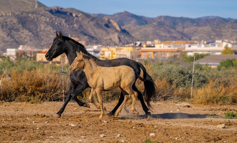 Ciężarna klacz: Energiczna i doświadczona klacz hodowlana z źrebięciem przy boku. Klacz jest sprzedawana bez źrebięcia. Klacz nosi gen PRl i z ogierem o maści champagne da w 100% źrebię o maści champagne. Źrebię może być nawet nosicielem genu Dun, ponieważ ma ciemną głowę i pręgę grzbietową. Więcej informacji na: www.caballoria.com