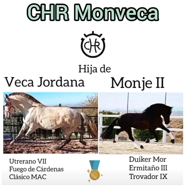 CHR Monveca Yegua castaña oscura PRE, nacida en 2025, con aires especiales. Preciosa potra castaña oscura/negra nacida en 2025, que destaca por su elegancia. Con una alzada actual de 150 y en adulta sera aproximadamente 167 cm. 3 aires especiales y muy elegantes. Ideal para jinetes que buscan una yegua con carácter y muy buen temperamento. Perfecta para entrenamiento, competición o como futura yegua de cría. Nacida y criada en casa particular y muy socializada a pasear por la calle.