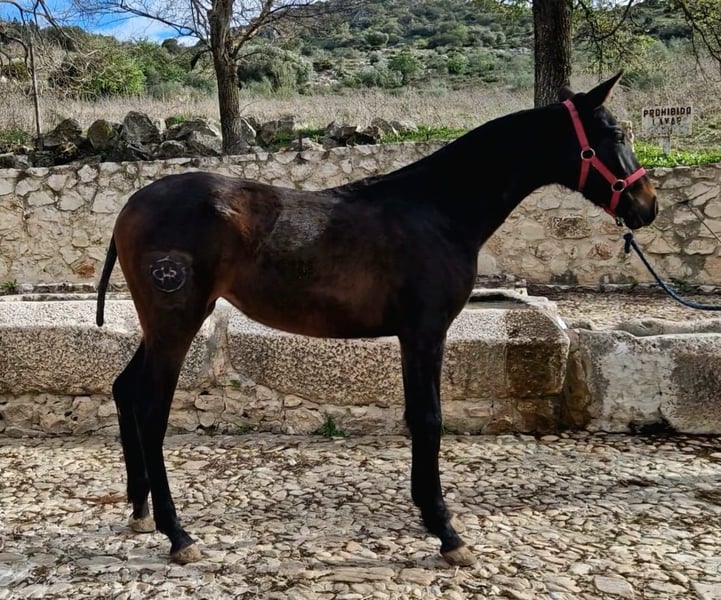 CHR Monveca Dark chestnut PRE mare, born in 2025, with exceptional presence. Beautiful dark chestnut/black filly born in 2025, renowned for her elegance. Currently standing at 150 cm, she will reach approximately 167 cm as an adult. She exhibits three exceptional and very elegant gaits. Ideal for riders seeking a mare with character and a very good temperament. Perfect for training, competition, or as a future broodmare. Born and raised in a private stable, she is very well socialized and accustomed to walking in the street.