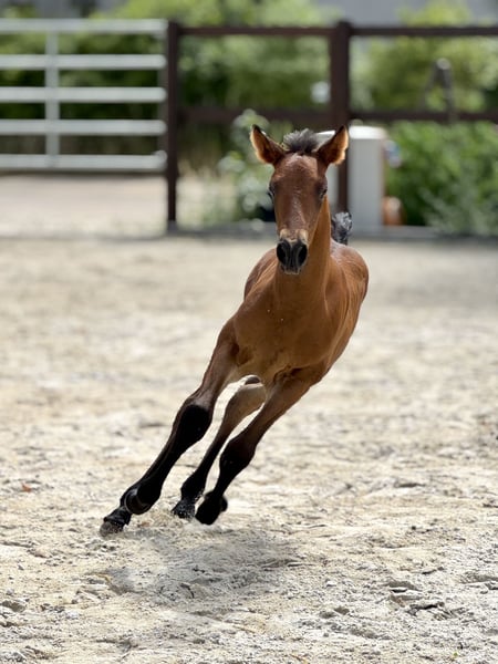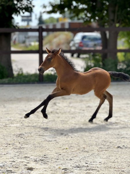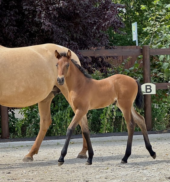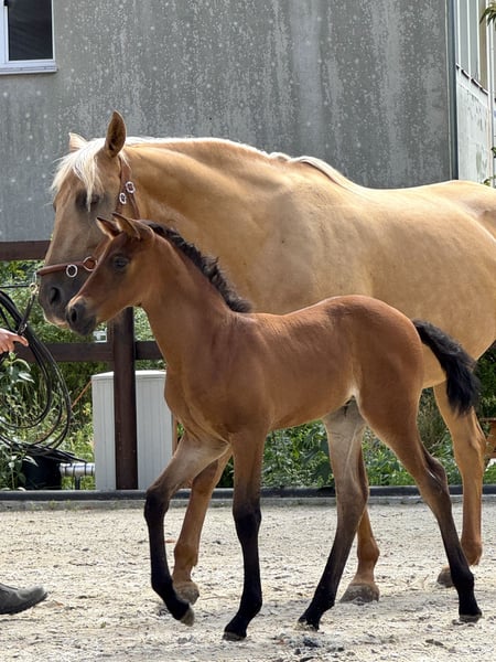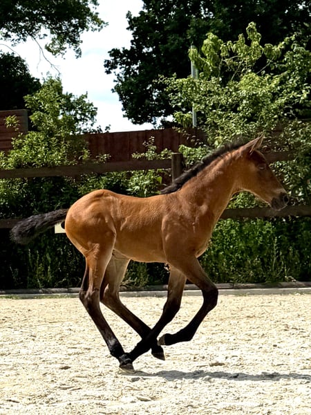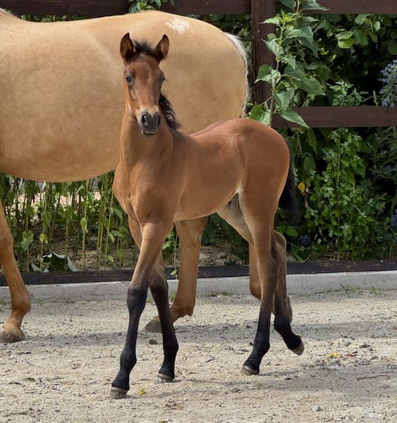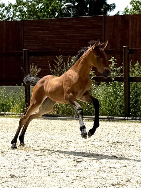 Our little Treidelhof Octava was born in perfect chestnut brown, completely without white markings. She moves with a lot of energy, rhythm, and shows herself to be very balanced in all gaits. Octava can be easily haltered and is currently learning to give her little hooves. She is curious and very affectionate towards humans. We are only offering her to the very best hands. She is a truly special foal. For those enthusiastic about PRE, it is interesting to note that she carries 70% Escalera blood on her mother's side and descends from the wonderful, famous line of Martinez Boloix on her father's side. For Octava, as for all our horses for sale, we primarily wish for a kind person with a sense of responsibility who treats themselves and the horse with care and patience. Our horses are completely unspoiled and have only had good experiences. A loving, nurturing upbringing is a matter of course for us. Octava, like all our young horses, is growing up in a herd/family environment. Please contact us personally only. We would never provide anonymous information about our horses. We wish for a friendly personal contact and are always happy to help if desired. We also greatly appreciate pictures and reports from our former horses.