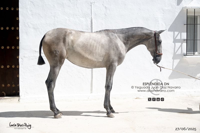 ¡Oportunidad de adquirir una bella y prometedora yegua! https://diaznavarro.es/esplendida-dn Se ofrece en venta una preciosa PRE, de raza pura, nacida en el año 2024. Es una yegua de color tordo picazo, con un aspecto impresionante y una presencia destacada. Ideal para quienes buscan un ejemplar de calidad, con potencial para doma, monta o cría. Nació de capa castaña. Futura potra de concurso. Muy movida. Líneas: Marco Antonio, Velero XI, Deco, Llamativo II, Colombiano III. Ventura Camacho, Granda, Yeguada Militar, Vizconde de la Montesina, Fernández Daza, Urquijo, D. Benito Zoido, Bohorquez. No pierda la oportunidad de conocerla y valorar todo su potencial. Para más información, no dude en contactarnos.