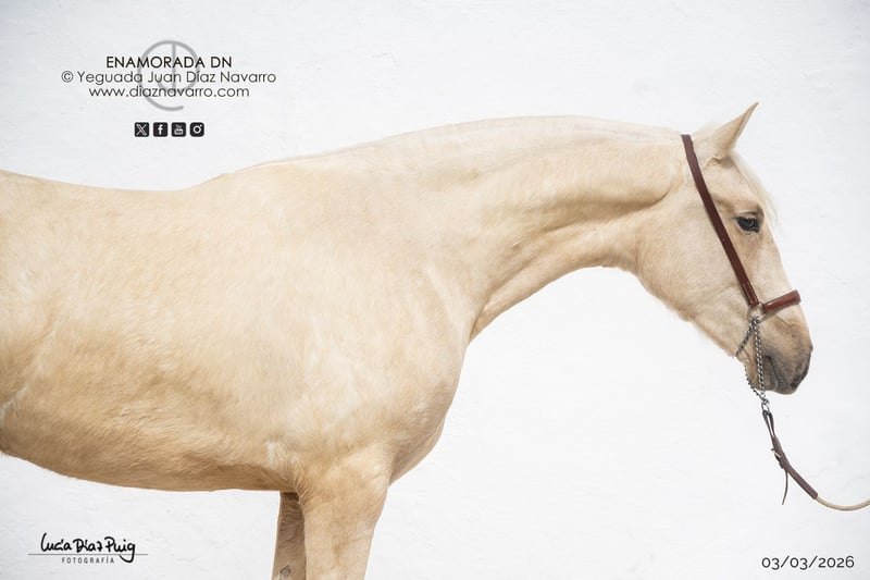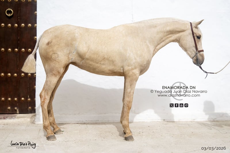 ¡Oportunidad de adquirir una potra con una capa espectacular y un físico increíble! https://diaznavarro.es/enamorada-dn Se vende preciosa yegua de raza PRE, nacida en el año 2024. De color palomino, con un pelaje brillante y llamativo. Tiene una alzada de 165 cm, ideal para diferentes disciplinas y actividades ecuestres. Esta ejemplar proviene de una excelente genealogía, garantizando calidad y potencial para futuras competencias o para uso en la reproducción. Es una yegua con carácter equilibrado, apta tanto para jinetes experimentados como para quienes desean iniciarse en el mundo del caballo. Capa genética (genotipo): ggAaeeCCrNN Alzada: 1’56m a la cruz (25/06/2025) Comentarios: añoja con mucho potencial, pudiendo dar crías de todas las capas menos las isabelas. Líneas: Divo, Norte A, Cepellón, Velero XI, Lego, Lebrijano III, Bizarro XIV, Llamativo II. Yeguada Militar, Vizconde de la Montesina, D. Benito Zoido, Paco Marti. No pierda la oportunidad de incorporar a su familia o finca una yegua de gran calidad y belleza. Para más información y consultas, no dude en contactarnos. WhatsApp: +34 629773610