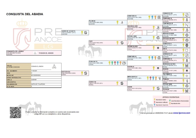 Conquista del Abadia is a very strong and athletic Pura Raza Española filly, born with us on 11.03.2024. Her mother, Artista Su, is a daughter of elite stallion Doblón-TR and on her mother's side a granddaughter of elite stallion Impaciente II. Artista achieves very high scores for her movements at every inspection. The father of Conquista is Quien de Susaeta (last 2 photos), grandson of elite breeding stallion Ermitaño III. Quien and his offspring also achieve very nice results in competitions for both morphology and movements. Conquista has a good basic groundwork, stands nicely still in the wash area, is accustomed to the farrier and veterinarian, and has already traveled multiple times. She has a very stable and calm personality. A little horse that you can take anywhere without worries. Conquista falls within the price category of €5,000 - €7,500. If you would like more information about Conquista or the other horses we currently have for sale, feel free to give us a call at +32 (0)489/36.10.15 or take a look at our Facebook page and our website (Yeguada El Abadia).