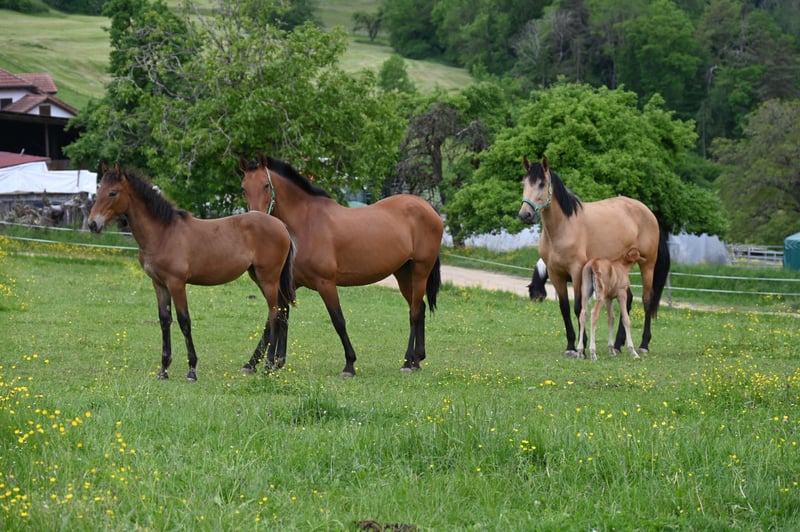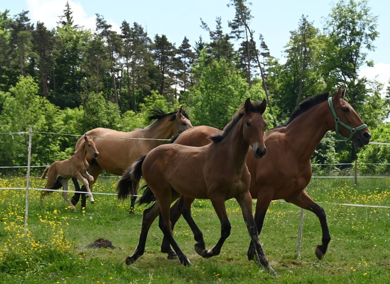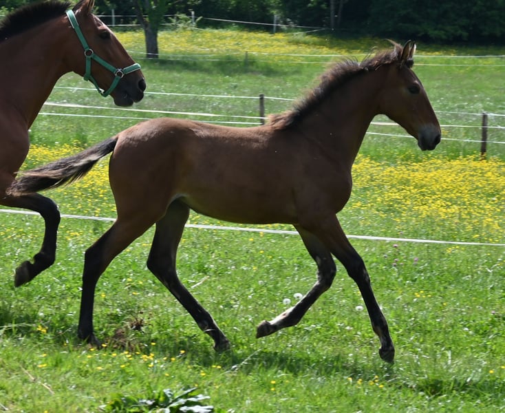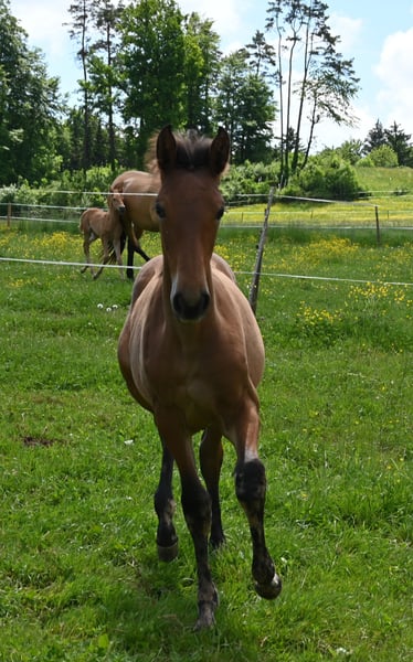 Morena Kubny is looking for her person. She is a PRE mare. Morena is very confident, clear-minded, and approachable. She is expected to grow to approximately 16.1 hands, with a baroque conformation, and possesses excellent and correct gaits. All of her foals have a solid foundation with good foal handling skills. She is accustomed to farm machinery, other animals, and children. She may also remain with us for further upbringing. Morena is weaned and was born in December 2024. Her dam is Lermosa MAZ. We are happy to introduce you to the horses from Monday to Saturday. The viewing costs €40 per session and will be refunded upon purchase.
