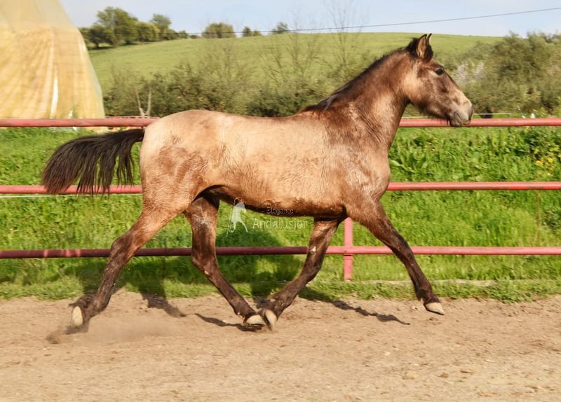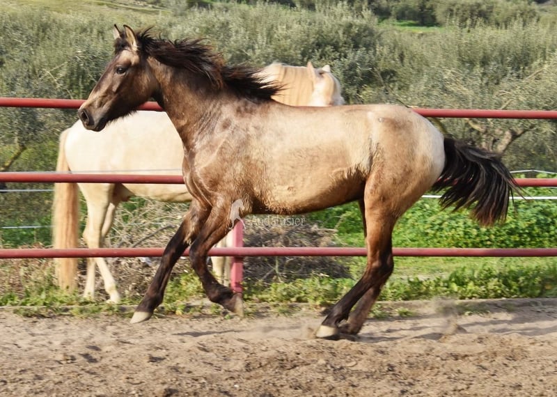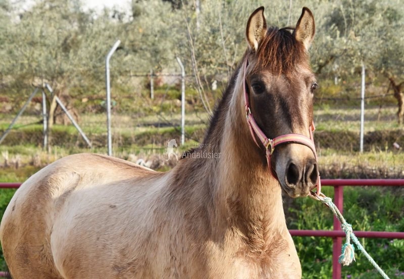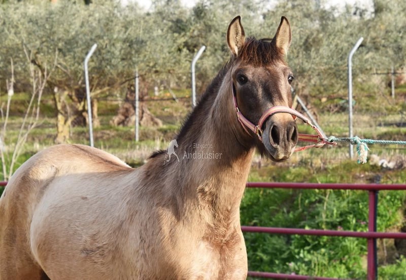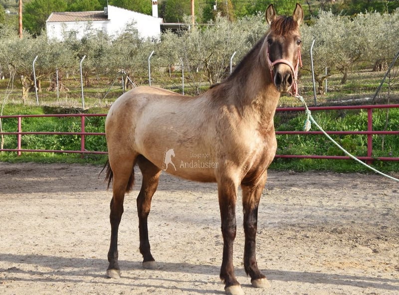 Carácter dulce, algo rudo, vive con otras yeguas en paddock, pequeño, color especial, caballo gris con gen crem, ascendencia: El Torno de la Cartuja, Dehesa la Granja, Las Lumbreras, abuelo Guindo VII está inscrito y calificado. www.elegante-andalusier.com