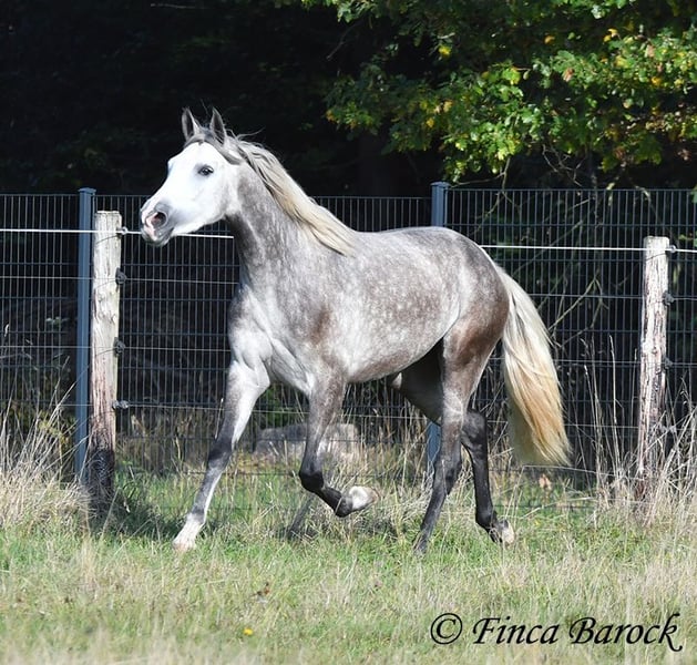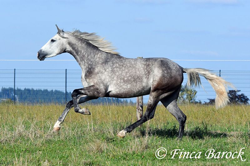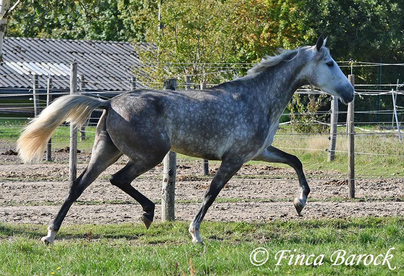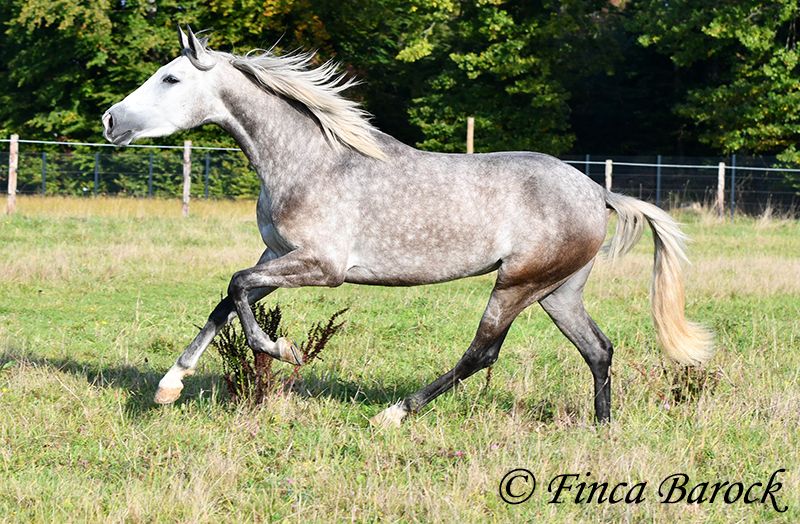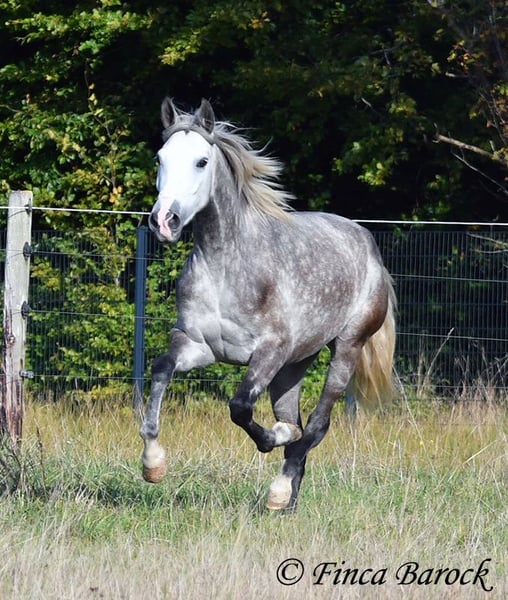 Rasse: PRE Name: Buleria AR IV Geschlecht: Stute Stockmaß: 159 cm Alter: 20.09.2022 Farbe: Schimmel Preis: 9800 € Vater: Zurito MIBXBII v. Algabeño MIBXII Mutter: Dakota CB v. Quebrado HBM II Buleria ist eine super süsse hochbeinige Maus mit einem freundlichen Charakter. Sie kennt das longieren am Kappzaum mit Sattel und Trense. Sie ist leicht in den GGA angeritten und zeigt sich als echte Musterschülerin. Hervorzuheben sind ihre sitzbequemen Bewegungen. Sie ist neugierig und aufgeschlossen, freut sich über neue Aufgaben und macht souverän mit. Wenn krach auf dem Hof ist (Traktor, Quart, Helilandung auf dem Nachbarfeld) steht sie immer in ihrer Paddockbox und schaut sich alles genau an. So freu nach dem Motto – cool da ist was los, das muss ich mir anschauen! Buleria kennt gemischte Herdenhaltung. Bei kleinen Spaziergängen um den Hof zeigt sie sich wenig umweltorientiert und eher neugierig bei ungekannten Dingen. Mit ihr bekommt man eine junge Lady, welche bereits gute Grundlagen gelegt bekommen hat, aber noch alle Wege offen stehen. inkl. klinischer tierärztlicher Untersuchung und Röntgenbildern Kontakt: Finca Barock, Tel. 0173-696 31 81, 56291 Wiebelsheim