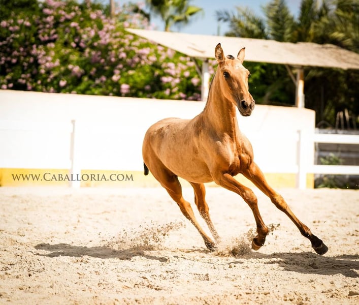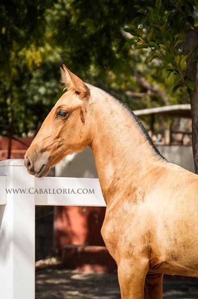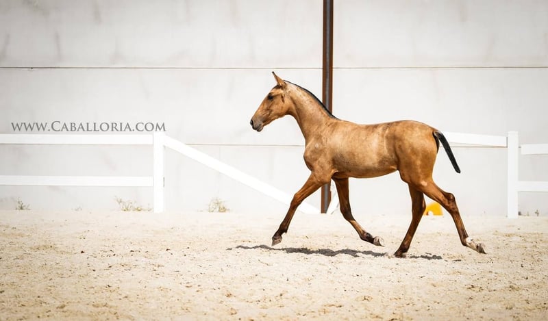 Veulen: Pura Raza Espanola merrieveulen Geboren in een stralende buckskin kleur, belichaamt dit jonge veulen de kwintessens van schoonheid en elegantie. Met een vol en indrukwekkend papier dat haar nobele afstamming bevestigt, staat ze als een testament voor uitstekende paardenfokkerij. Haar bewegingspatronen zijn een lust voor het oog. Elke stap die ze zet straalt gratie en kracht uit, waardoor ze een ideale kandidaat is voor dressuurwedstrijden. Haar ouders, beiden grootramig, hebben niet alleen hun indrukwekkende gestalte aan haar doorgegeven, maar ook hun uitmuntende temperament. Dit merrieveulen is niet alleen voorbestemd voor de dressuursport, maar ook perfect geschikt voor de fokkerij. Met haar genetische uitmuntendheid zou ze de volgende generatie toppaarden kunnen voortbrengen. Voor wie op zoek is naar een betrouwbare en elegante vrijetijdspartner biedt ze ook het perfecte pakket.