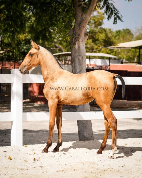 Foal: Pura Raza Espanola Filly Born in a radiant Buckskin hue, this young foal embodies the quintessence of beauty and elegance. With a full and impressive paper confirming her noble pedigree, she stands as a testimony to excellent horse breeding. Their movement patterns are a real feast for the eyes. Every step she takes exudes grace and power, making her an ideal candidate for dressage competitions. Her parents, both large-framed, passed on to her not only her impressive stature but also her outstanding temperament. This filly is not only predestined for dressage, but also perfect for breeding. With her genetic excellence, she could produce the next generation of top horses. For those who are looking for a reliable and elegant leisure partner, it also offers the perfect package.