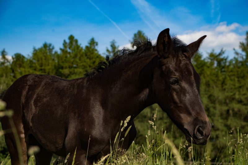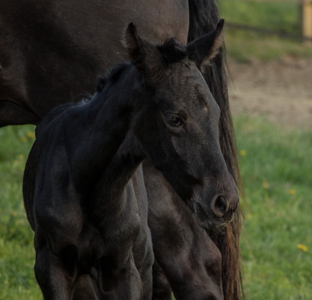 Alhaja ist eine sehr ausdrucksstarke junge Rappstute (Glanzrappe ohne Abzeichen) mit raumgreifenden Bewegungen.