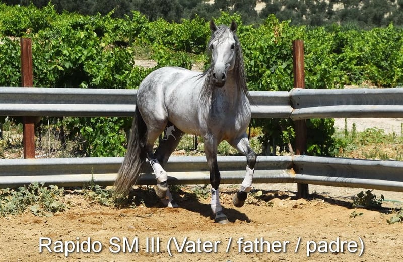 fin karaktär med temperament, rå, står ute med andra ston, bra rörelser, härstamning: Escalera, Yeguada de Ymas, Yeguada Militar, media Guitarra, Paco Marti, Jesus Gil y Gil www.elegante-andalusier.com