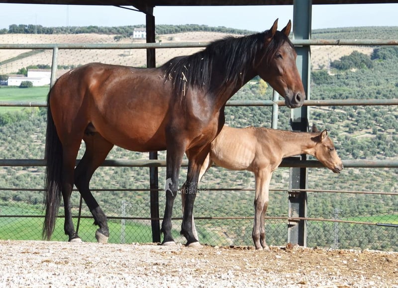lieber Charakter mit Temperament, roh, steht mit anderen Stuten draußen, gute Bewegungen, gekört, mit frisch geborenem Falb-Stutfohlen bei Fuß, Abstammung: Escalera, Yeguada de Ymas, Yeguada Militar, media Guitarra, Paco Marti, Jesus Gil y Gil www.elegante-andalusier.com