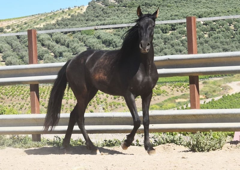 Caractère aimable, à l'état brut, vit dehors avec d'autres juments, bons mouvements et bonne lignée, Ascendance : Hnos Camacho Benitez, Gonzalo Valenzuela Ruiz, Escalera, l'arrière-arrière-grand-père Obcecado est qualifié www.elegante-andalusier.com