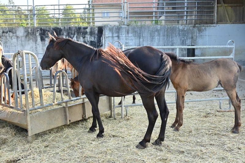 Macarena de Lucia is a 5.5-year-old PRE black mare with pure Escarlata lineage. Her breeding index is 98.31%, and she is a homozygous mare for the black color EEaa. Currently, Macarena stands at 159 cm tall, and it is likely that she may grow another 1 or 2 cm. She is very strong-minded, affectionate, and friendly. Macarena is ridden both in the arena and on trails, where she demonstrates good behavior with a pleasant forward drive. So far, she has had 2 filly foals, one of which she is still nursing until September; the births went well. The Escalera line is one of the oldest bloodlines in Spain and is the result of a consistent breeding program by a family that goes back more than 200 years. A notable characteristic of Escalera horses is their high willingness to perform, baroque, noble horses with physical strength, good rideability, and outstanding movements. The foundation of Escalera horses consisted mainly of brown mares, with few exceptions of blacks, which were then paired with the best and most athletic stallions from the Yeguada Militar. For this reason, Escalera horses are particularly suited for dressage and consistently rank high at various breeding shows. Macarena is vaccinated, regularly dewormed, and in excellent health. She is familiar with farm machinery and other farm animals as well as playing children, and she is good for the farrier and loading. After the birth of her foal, she was checked by an osteopath. Her daughter Hermosa Perla Negra can be weaned starting in September. Sire: Escogido XXIII Dam: Manzanillo XII