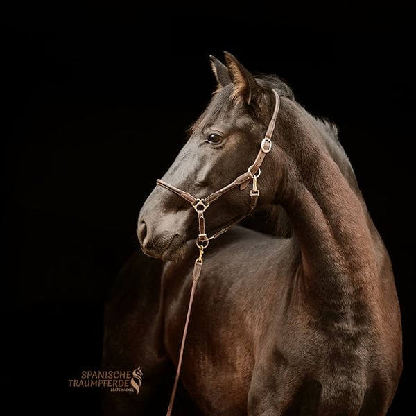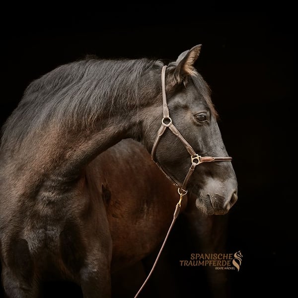 PRE-merrie QUINTA SH – Elegantie en Charme in kastanjekleurige tinten Onze prachtige PRE-merrie QUINTA SH, geboren in 2020, zoekt haar soulmate vanuit Traventhal. Met haar comfortabele stokmaat van 159 cm combineert ze barokke elegantie met een krachtige uitstraling. Haar schitterende glanzende, zwartgelakte vacht benadrukt haar uitstraling en maakt haar tot een echte blikvanger. Deze barokke schoonheid onderscheidt zich door haar aangename karakter en haar vriendelijke, hoffelijke aard. Ze is aangezadeld, gezond en klaar voor verdere inzet in de recreatie, dressuur of fokkerij. Bij interesse of voor meer informatie ben ik graag bereikbaar, ook telefonisch. Een kennismaking met onze QUINTA SH is na afspraak mogelijk.