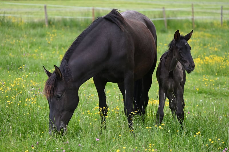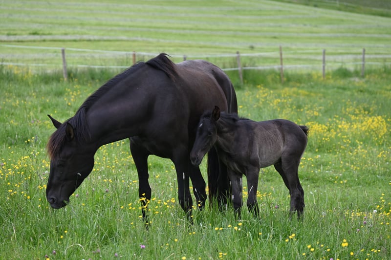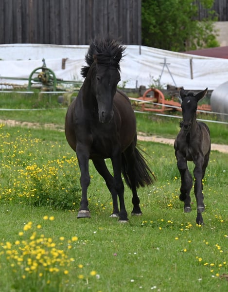 Macarena de Lucia is a 5.5-year-old PRE black mare with pure Escarlata lineage. Her breeding index is 98.31%, and she is a homozygous mare for the black color EEaa. Currently, Macarena stands at 159 cm tall, and it is likely that she may grow another 1 or 2 cm. She is very strong-minded, affectionate, and friendly. Macarena is ridden both in the arena and on trails, where she demonstrates good behavior with a pleasant forward drive. So far, she has had 2 filly foals, one of which she is still nursing until September; the births went well. The Escalera line is one of the oldest bloodlines in Spain and is the result of a consistent breeding program by a family that goes back more than 200 years. A notable characteristic of Escalera horses is their high willingness to perform, baroque, noble horses with physical strength, good rideability, and outstanding movements. The foundation of Escalera horses consisted mainly of brown mares, with few exceptions of blacks, which were then paired with the best and most athletic stallions from the Yeguada Militar. For this reason, Escalera horses are particularly suited for dressage and consistently rank high at various breeding shows. Macarena is vaccinated, regularly dewormed, and in excellent health. She is familiar with farm machinery and other farm animals as well as playing children, and she is good for the farrier and loading. After the birth of her foal, she was checked by an osteopath. Her daughter Hermosa Perla Negra can be weaned starting in September. Sire: Escogido XXIII Dam: Manzanillo XII