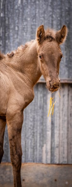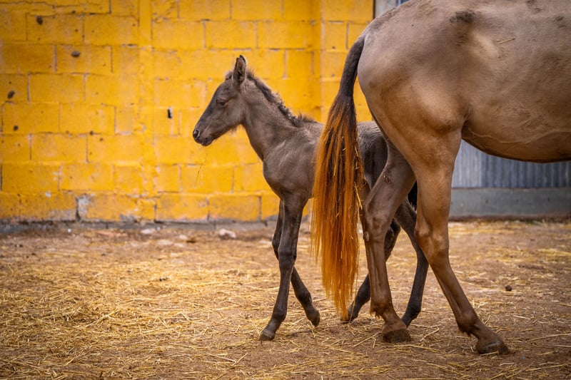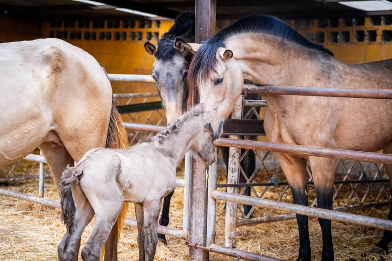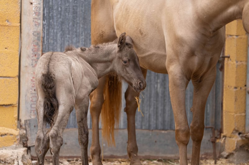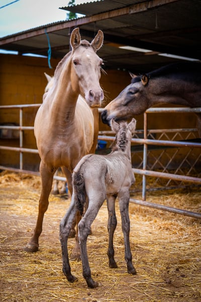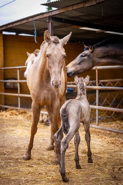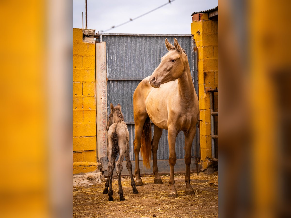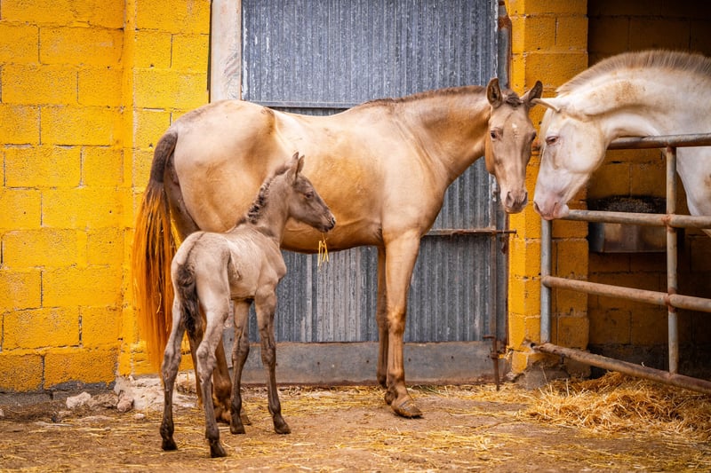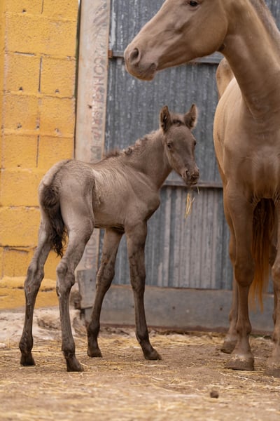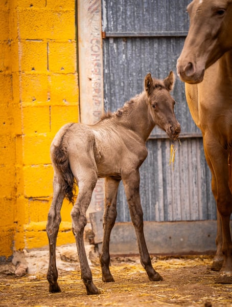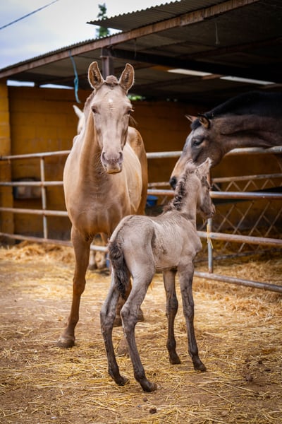 Breeding: Young 3 year old breeder with her first foal at foot ( stallion ). This time we have only taken a few good photos so that the mare does not have any stress with her foal, which is only a few hours old! The price is for the mare with foal. Her color genetics are: ggaaEEPRLPRL. She carries Peralta, Yeguada Militar and Bohorquez blood in her abandonment. The foal is also champagne and has typical characteristics of a Grullo ( fertiliser ). / More information on request!
