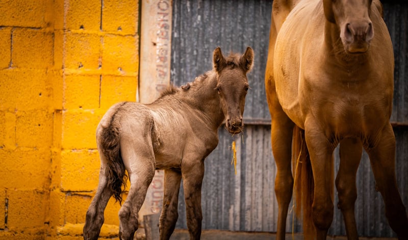 Elevage : Jeune éleveuse de 3 ans avec son premier poulain au pied (étalon). Cette fois-ci, nous n’avons pris que quelques bonnes photos pour que la jument n’ait pas de stress avec son poulain, qui n’a que quelques heures ! Le prix est pour la jument poulain. Sa génétique de couleur est : ggaaEEPRLPRL. Elle porte le sang de Peralta, Yeguada Militar et Bohorquez dans son abandon. Le poulain est également champagne et présente les caractéristiques typiques d’un Grullo (engrais). / Plus d’informations sur demande !