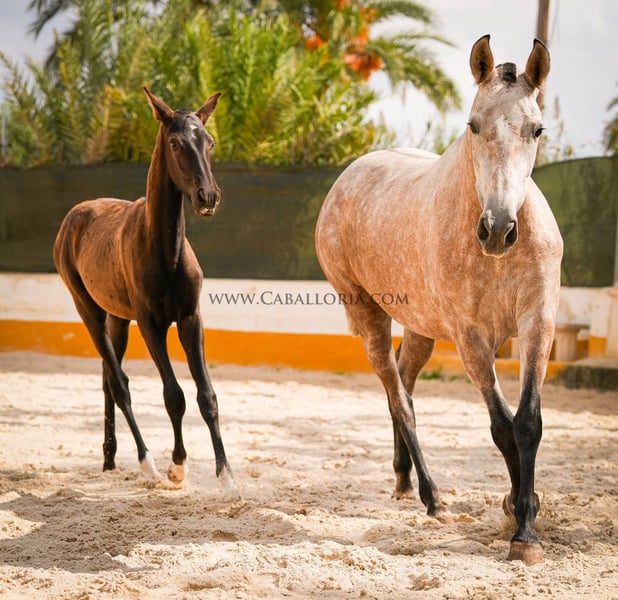 Cría: Nos complace presentarles una impresionante yegua gris roja PRE del año 2019. Con una altura actual de 164 cm, impresiona no solo por su impresionante tamaño, sino también por su genética única. Es portadora de un gen de perla, una genética de color rara y codiciada que la convierte en un verdadero punto de atracción. La yegua se muestra en hermosas líneas barrocas, típicas de la raza PRE. Su aspecto musculoso, combinado con movimientos elegantes y expresivos, la convierten en una opción ideal para los cultivadores. Sus andares son fluidos y armoniosos. Para aquellos que buscan un caballo joven que esté dispuesto a aprender y crecer con ellos, ofrecemos la posibilidad de comprar la yegua ya montada por un cargo adicional. Esto no solo le da un caballo valioso para la cría, sino también un caballo que ya ha adquirido algo de experiencia en el trabajo bajo silla. Por último, nos gustaría destacar que esta yegua gris roja PRE no solo convence por sus cualidades externas, sino también por su carácter equilibrado y amistoso. Siempre está dispuesta a aprender y es cooperativa, por lo que es una opción maravillosa tanto para los criadores ambiciosos como para los amantes de la raza PRE. Aprovecha la oportunidad y conoce mejor esta joya. Un caballo que sabe convencer en todos los aspectos con su colorido, sus andares y su carácter.