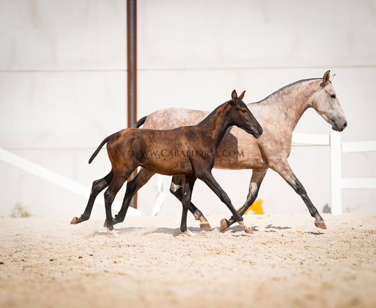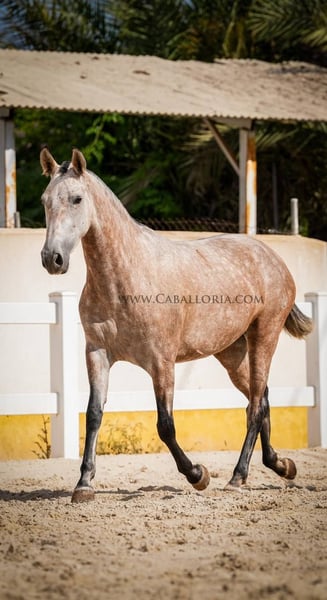 Breeding: We are pleased to introduce you to an impressive PRE red grey mare from the 2019 vintage. With a current height of 164 cm, she impresses not only with her impressive size, but also with her unique genetics. She carries a Pearl Gene, a rare and sought-after color genetics that makes her a real eye-catcher. The mare shows herself in beautiful baroque lines, which are typical for the PRE breed. Her muscular appearance, combined with elegant and expressive movements, make her an ideal choice for growers. Their gaits are fluid and harmonious. For those who are looking for a young horse that is willing to learn and grow with them, we offer the possibility to purchase the mare already ridden for an extra charge. This not only gives you a valuable horse for breeding, but also a horse that has already gained some experience in working under saddle. Finally, we would like to emphasize that this PRE red grey mare not only convinces with her external qualities, but also with her balanced and friendly nature. She is always willing to learn and cooperative, making her a wonderful choice for ambitious breeders as well as lovers of the PRE breed. Take the chance and get to know this gem better. A horse that knows how to convince in every respect with its colouring, its gaits and its character.