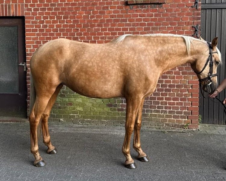 This stunning PRE mare in a special Palomino color is searching for her soulmate. She has a sweet, open, and friendly character and loves to explore new things with her human partner. She is 7 years old and approximately 16.1 hh. Her life has so far been spent in a small hobby farm herd, and she has already given birth to two healthy foals (a chestnut mare with Prl and a Cremello stallion). For this reason, she has not yet been backed under saddle, but she has always been handled from the ground, so she is familiar with human interaction and work, and she always approaches with kindness and motivation. This means she can be easily backed in her new home. In her new environment, she could be suited for many disciplines—whether continuing in breeding or dressage, working in Working Equitation, showing, or simply as a leisure partner. She spent her childhood on pasture with a large herd of mares and foals. She comes from a private owner and was intended to remain a broodmare in a small private breeding farm with a family atmosphere. Unfortunately, due to personal reasons, the family has to part with their hobby farm and this beautiful mare, and they are now looking for an excellent new home for her. Location: East Westphalia, Germany