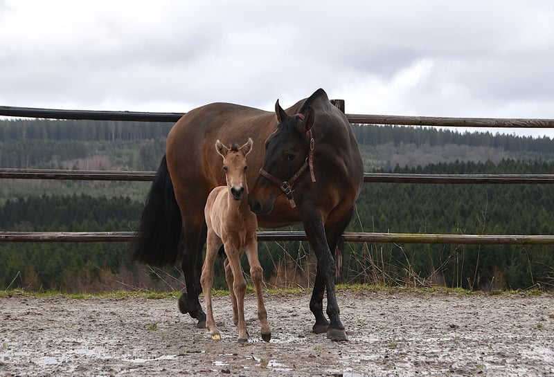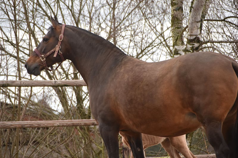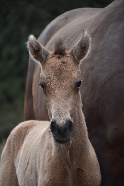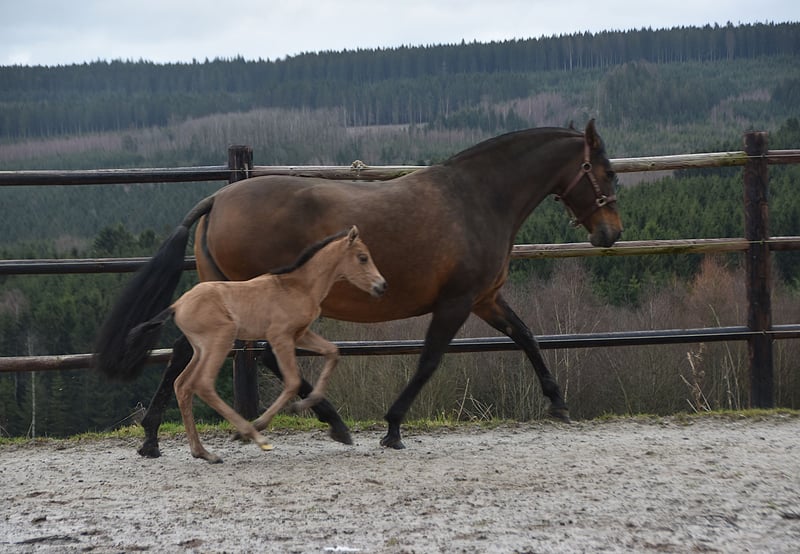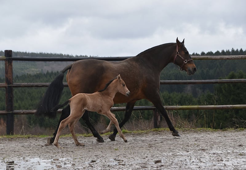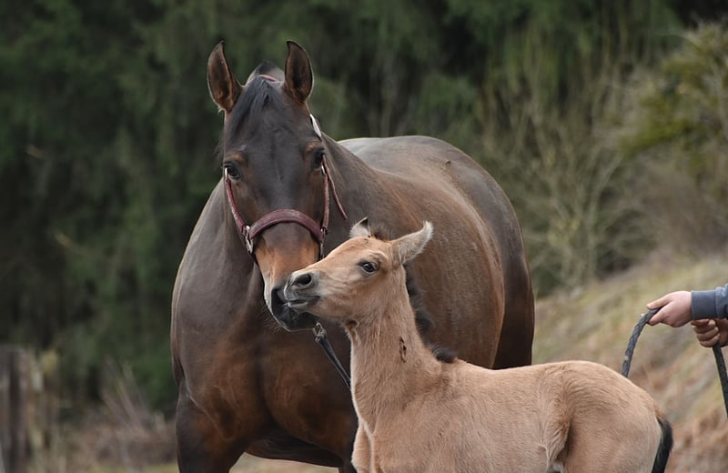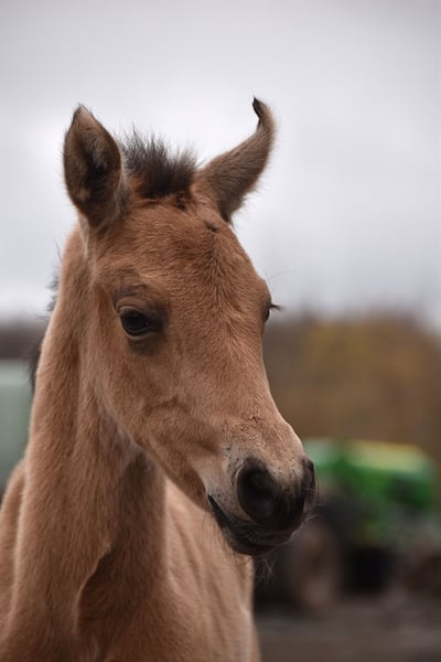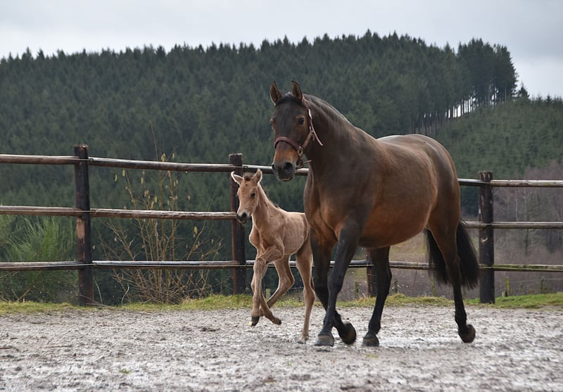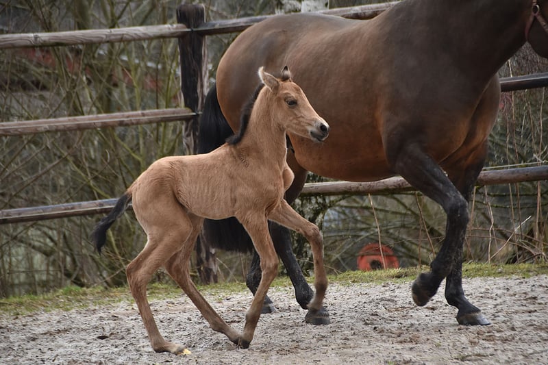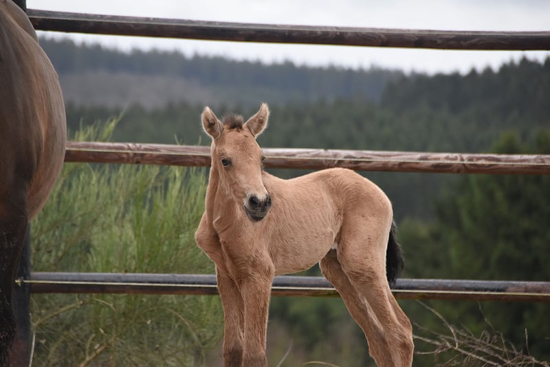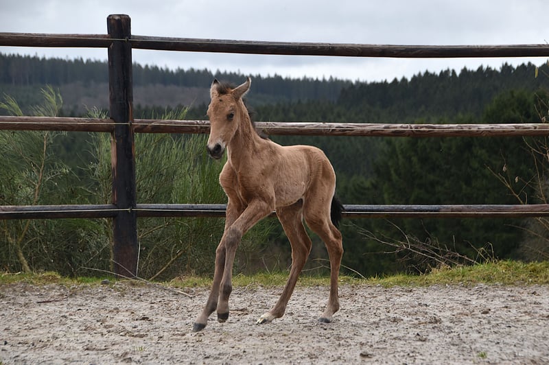 Buckskin PRE filly by Diva Madeira NJ × Mar Wonderful Diva herself is by Sevillano De Mile out of Descerada S. She became breed champion at CCE 2023 with the best movements in her section ♥️ Her sire, Sevillano: a recommended young stallion, out of two calificado parents. He was consecutively twice reserve champion in functionality at SICAB and also won the bronze medal twice in morphology at SICAB. Her dam, Descerada S: 2012 – Best movements and reserve champion in Bristol (UK) 2013 – Gold medal in Massenhoven (Belgium) 2015 – Absolute champion (the very first mare) in functionality 2016 – Champion for best movements and reserve champion in Avenches (Switzerland) 2018 – Best mare movements at the Central European Championship in Massenhoven (Belgium) Mar Wonderful is our perlino stallion and passes on powerful movement as well as a straightforward and endearing character to his foals. She is a straightforward, affectionate, and curious filly. All paperwork is in order: ANCCE documents, carta, and genetic color test. This filly is looking for her human partner 🥹🐴
